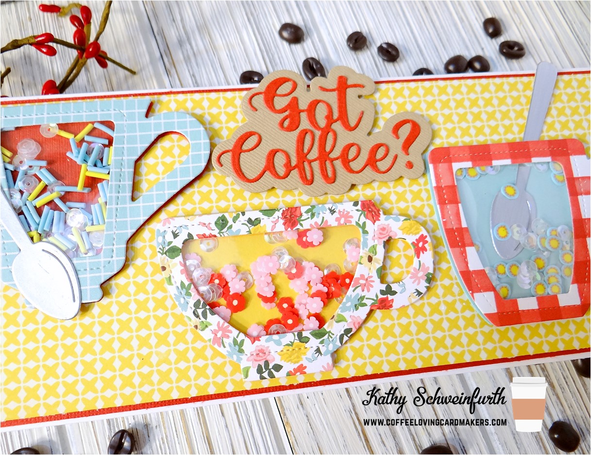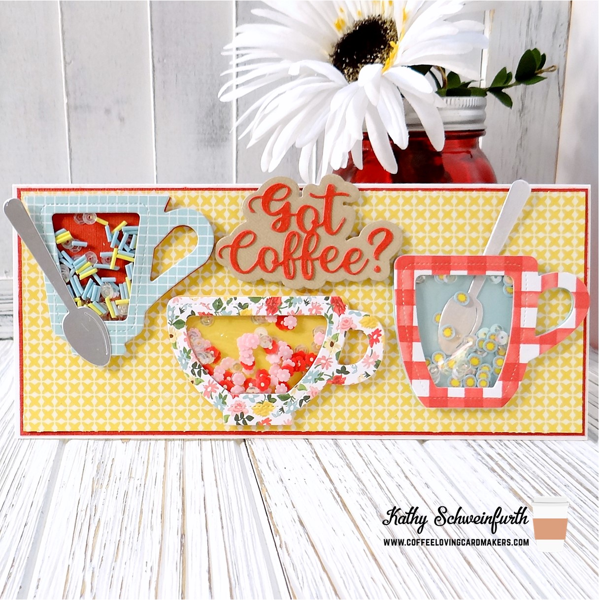 For my slimline card, I used these super cute shaker dies from Kat Scrappiness: Cuppa Love Shaker Card Dies plus several different Kat Scrappiness sprinkles. There are tons of fun shaker elements to choose from including the faux Coffee Beans I’ve scattered around! The Got Coffee? word/shadow dies are also from Kat Scrappiness.