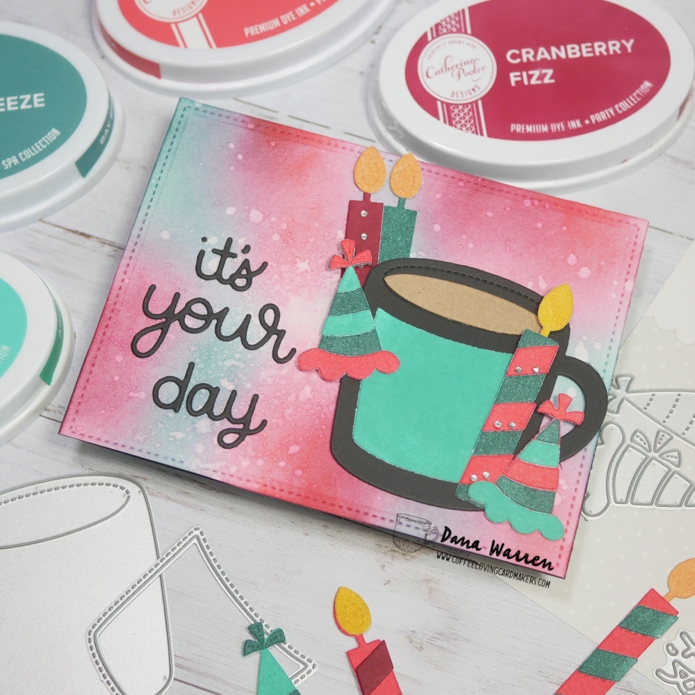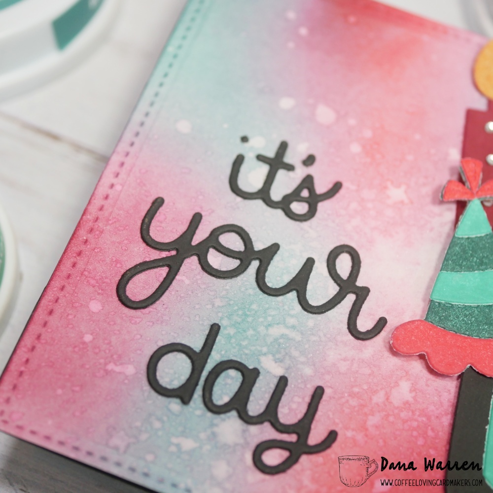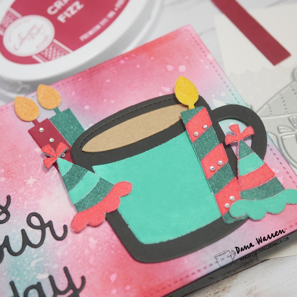 First, I pulled out some watercolor paper and ink blending all the colors except black. Then I added some splatters of water and dabbed it away to get lighter areas. While that dried I used the ink pads on white cardstock and then used most of the dies from Pretty Pink Posh Birthday Mug Additions and the mug from Winter Mug Dies.