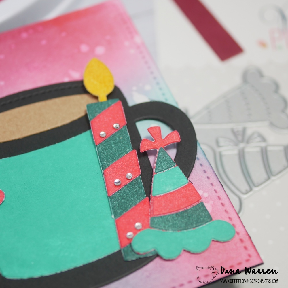 After cutting everything I got to mixing the colors and adhering the candles and party hats together. The mug received an aqua wrap and I added kraft cardstock at the top of the mug for the coffee. I also added tiny clear rhinestones to some of the candles and party hats.
