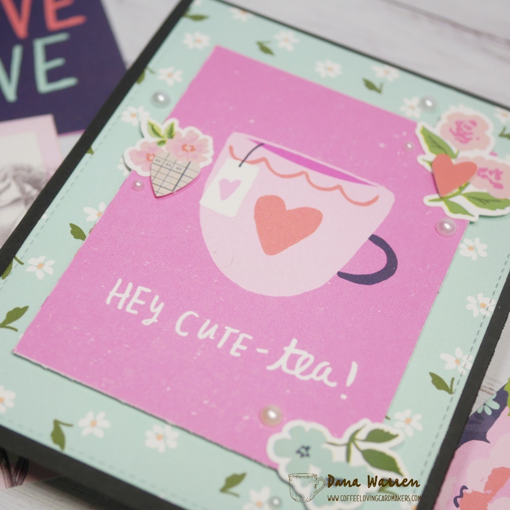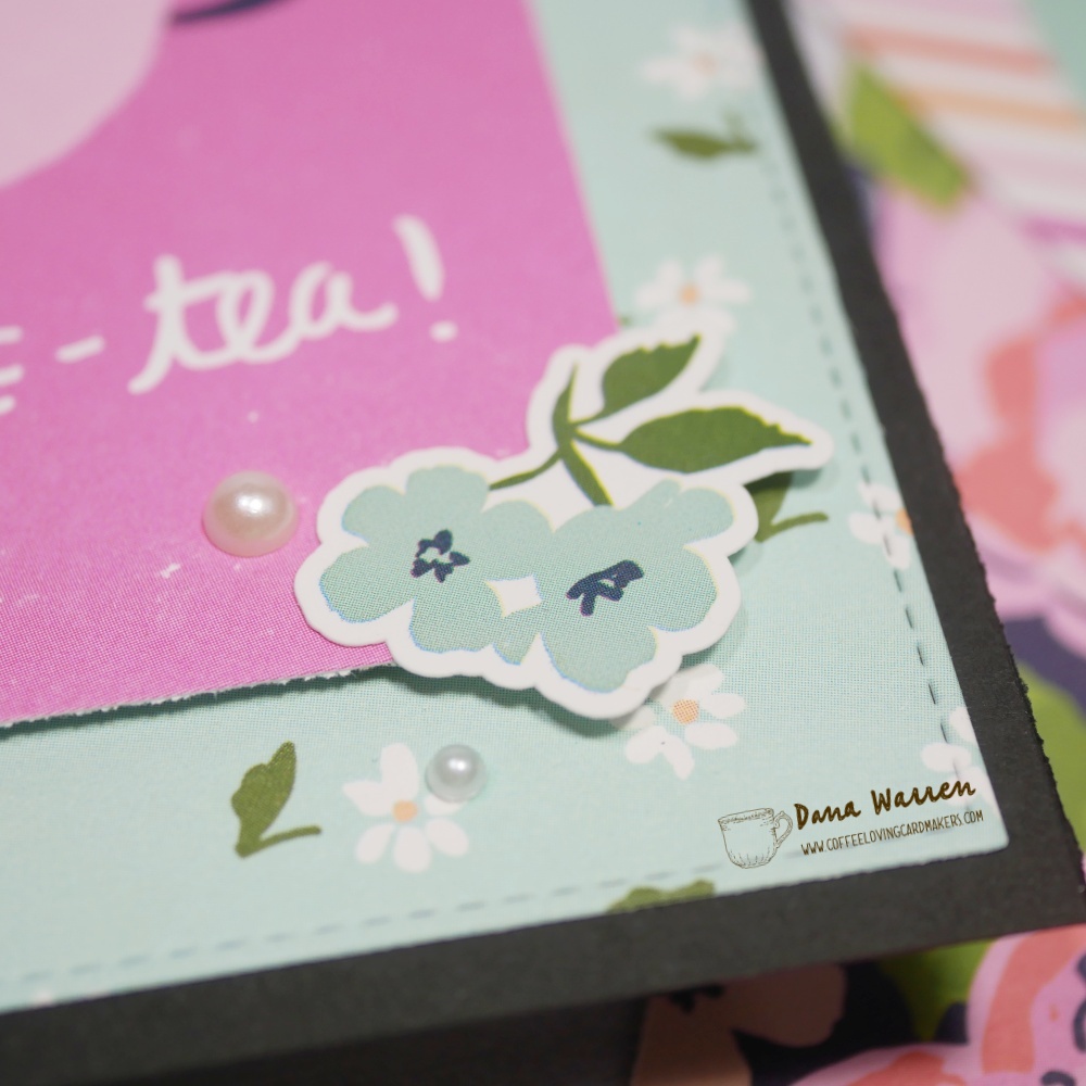 I picked a daisy pattern from the collection pack, trimmed it down, and adhered it to a black card base. Then I added the cute tea journal card with foam tape.