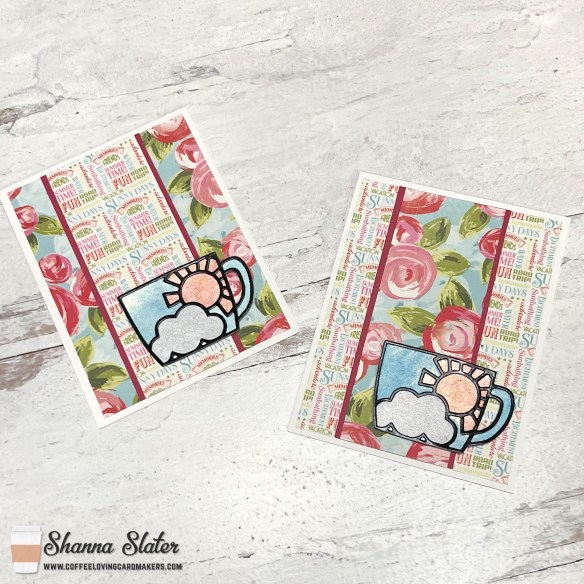 Hello and welcome! This is Shanna today with another Mugshot Monday! Today’s set of cards features one of my all time favorite caffeinated dies from a previously long standing Super Sponsor, (now sadly closed) Paper Smooches! I combined the fun die with a sketch from Jess Crafts. I love using sketches, especially when trying to utilize some of my pattern paper hoard.