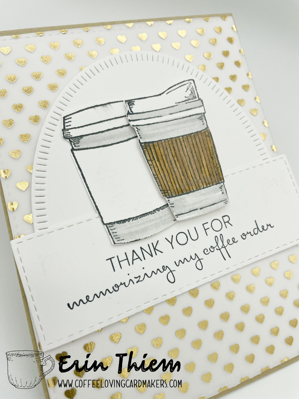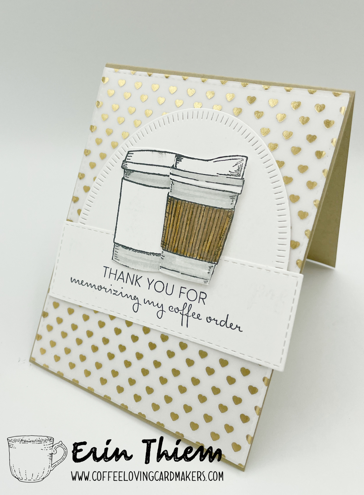Hello, Erin here for another Creative Chaos Saturday post…. I’m such a sucker for CAS white on white… and when I went looking for a piece of patterned paper for this card found this DCWV vellum heart piece my heart said yes. I’ve paired a MFT sentiment with Divinity Designs coffee cups and an dies from both MFT and Pink Fresh Studio for today’s card.
