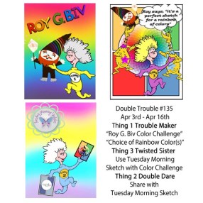 Thanks so much for stopping and I hope I made you giggle! I’m playing along over at Double Trouble Challenge Blog ROY G BIV Challenge with my rainbow of colors on this one. There is a sketch twist too that I didn’t follow but you can for an extra chance to win and to play along with their partner. Check it out and play along!