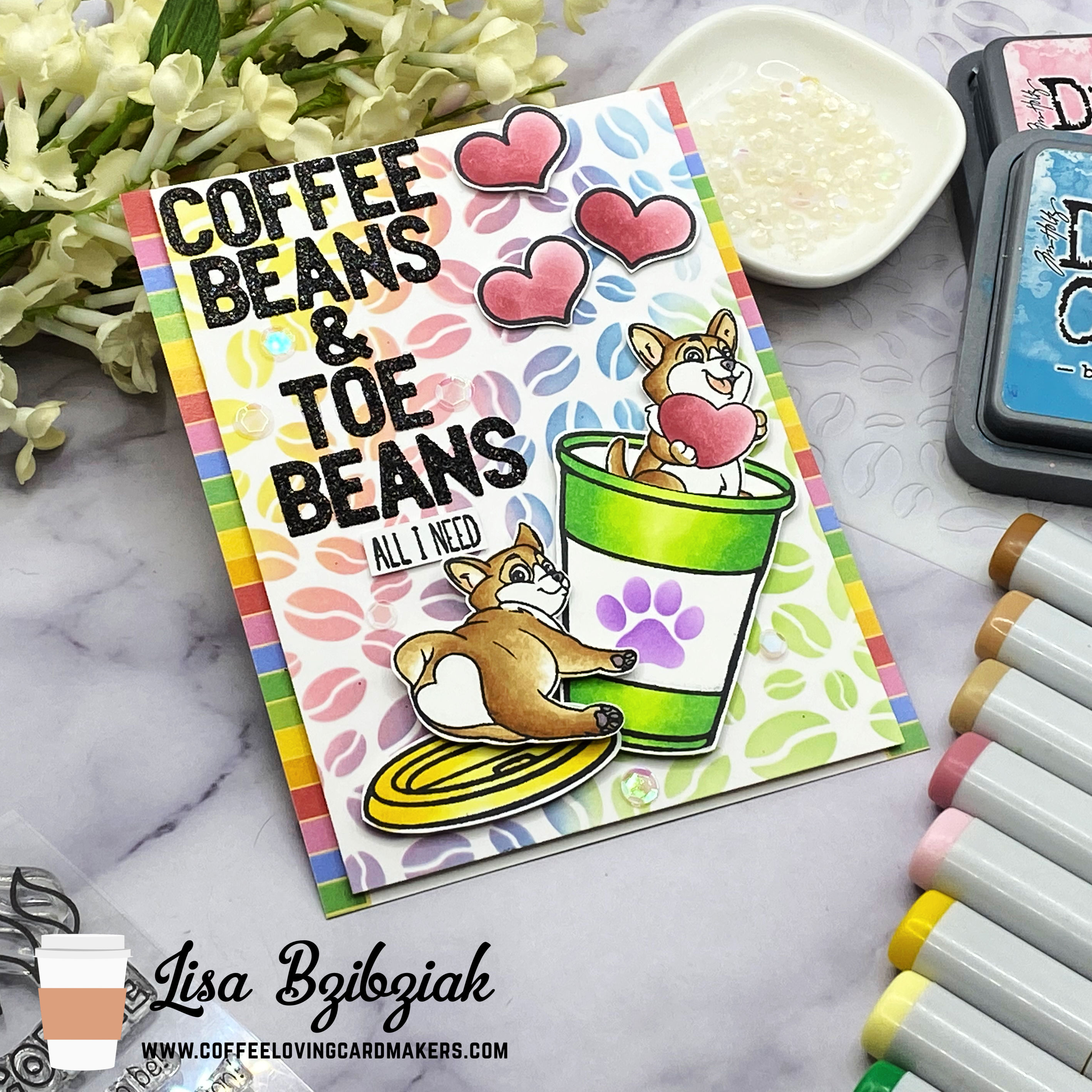So… do you know toe beans? … lol… when I started this card, my plan was just for the one pup in a cup and I was looking at that other one and decided I needed to have him on there too and when I was coloring his paws I was thinking about how much I love those toe beans and there is nothing better than sitting on the couch with my very good boy and his toe beans with a cup of coffee… and this sentiment popped in my head…. and that’s all she wrote!
