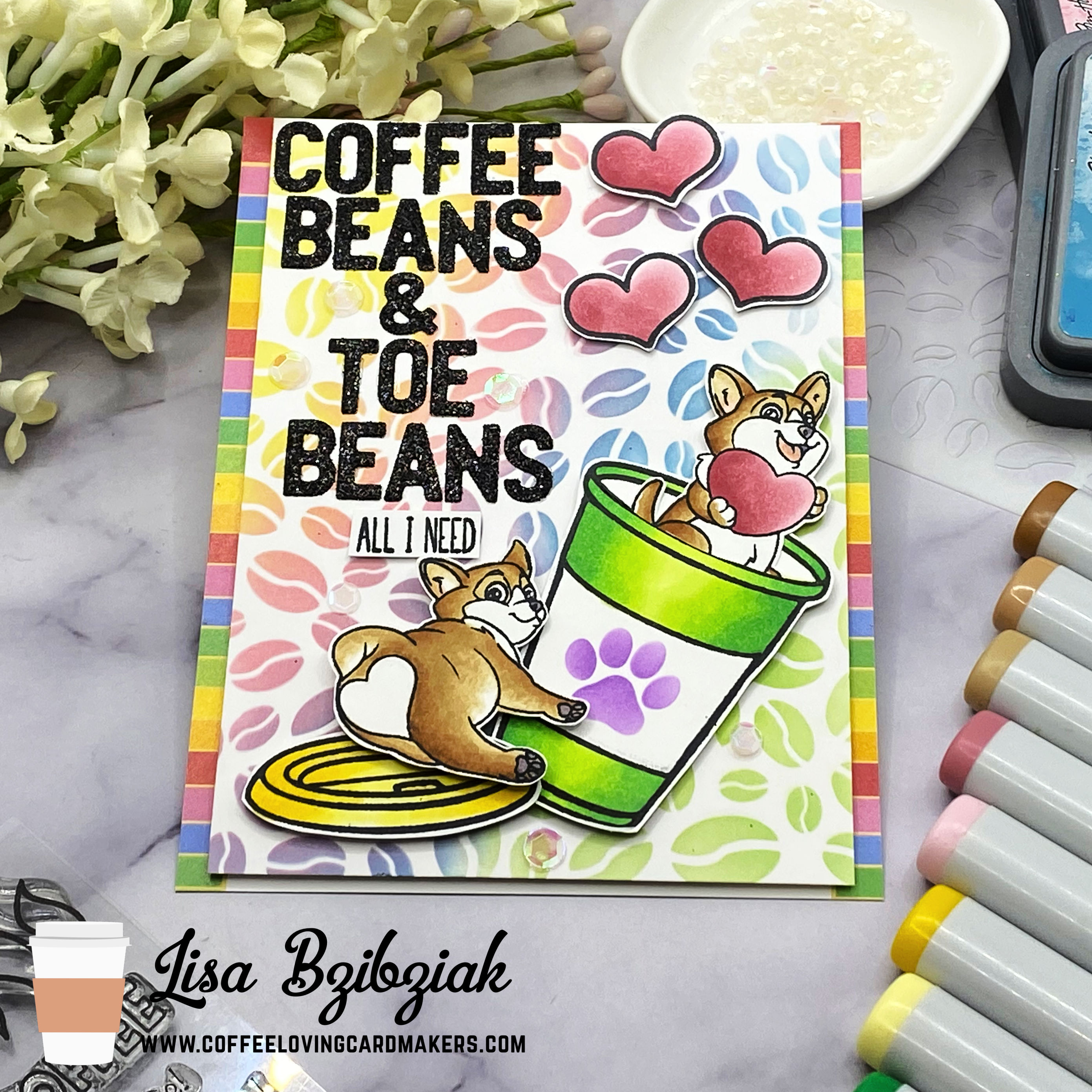 So… do you know toe beans? … lol… when I started this card, my plan was just for the one pup in a cup and I was looking at that other one and decided I needed to have him on there too and when I was coloring his paws I was thinking about how much I love those toe beans and there is nothing better than sitting on the couch with my very good boy and his toe beans with a cup of coffee… and this sentiment popped in my head…. and that’s all she wrote!