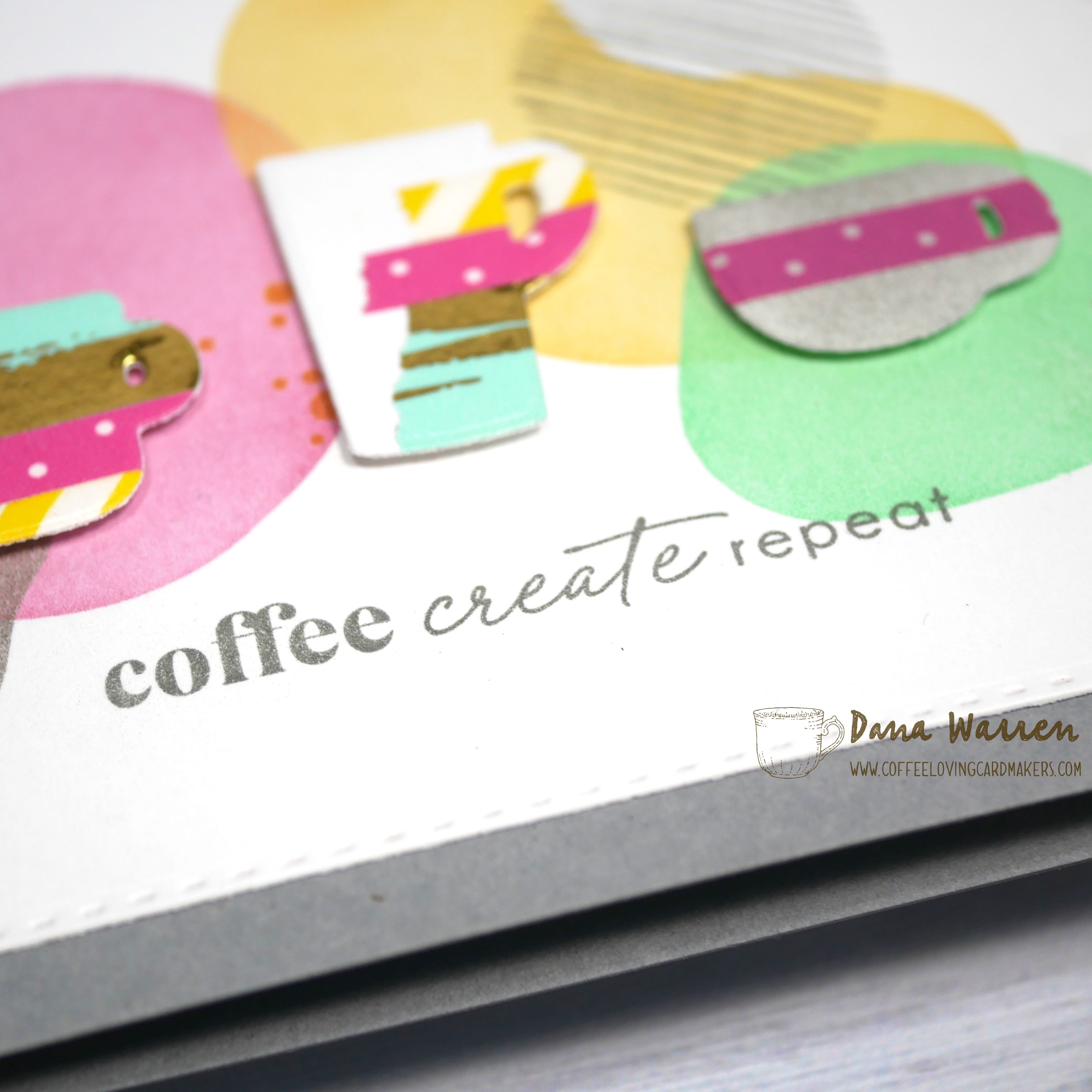 Next, I played around with the cups and finally decided to place the three of them equally across the card. For a sentiment, I used Coffee Create Repeat, which is also the name of the set which is from the card kit. Last I added the panel on a grey card base.