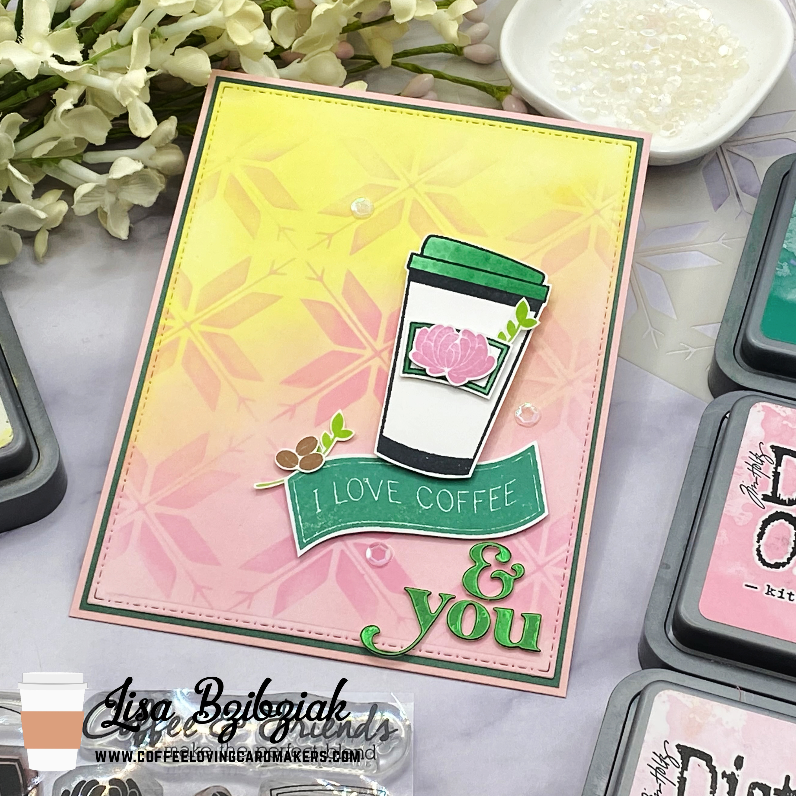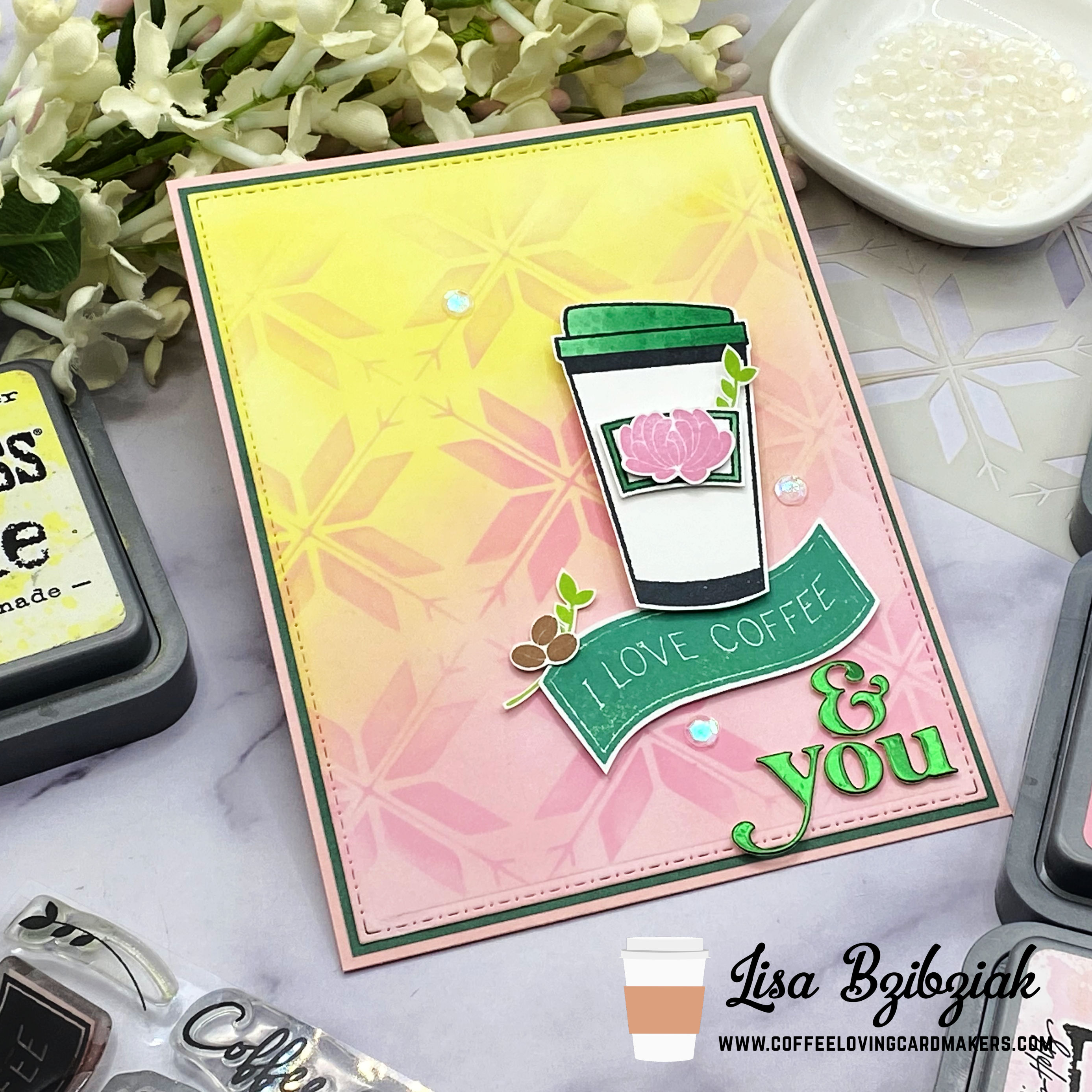 The Christmas Folk Snowflake Stencil is awesome and I think it’s great for a cool background Christmas or not! I used a brighter green than usual and love it with the pink and yellow! I stamped cut and colored the images from the I Love Coffee stamp set and popped them up over the top of the card and then modified the sentiment using the new Modern Typeset alpha dies from Miss Ink Stamps.