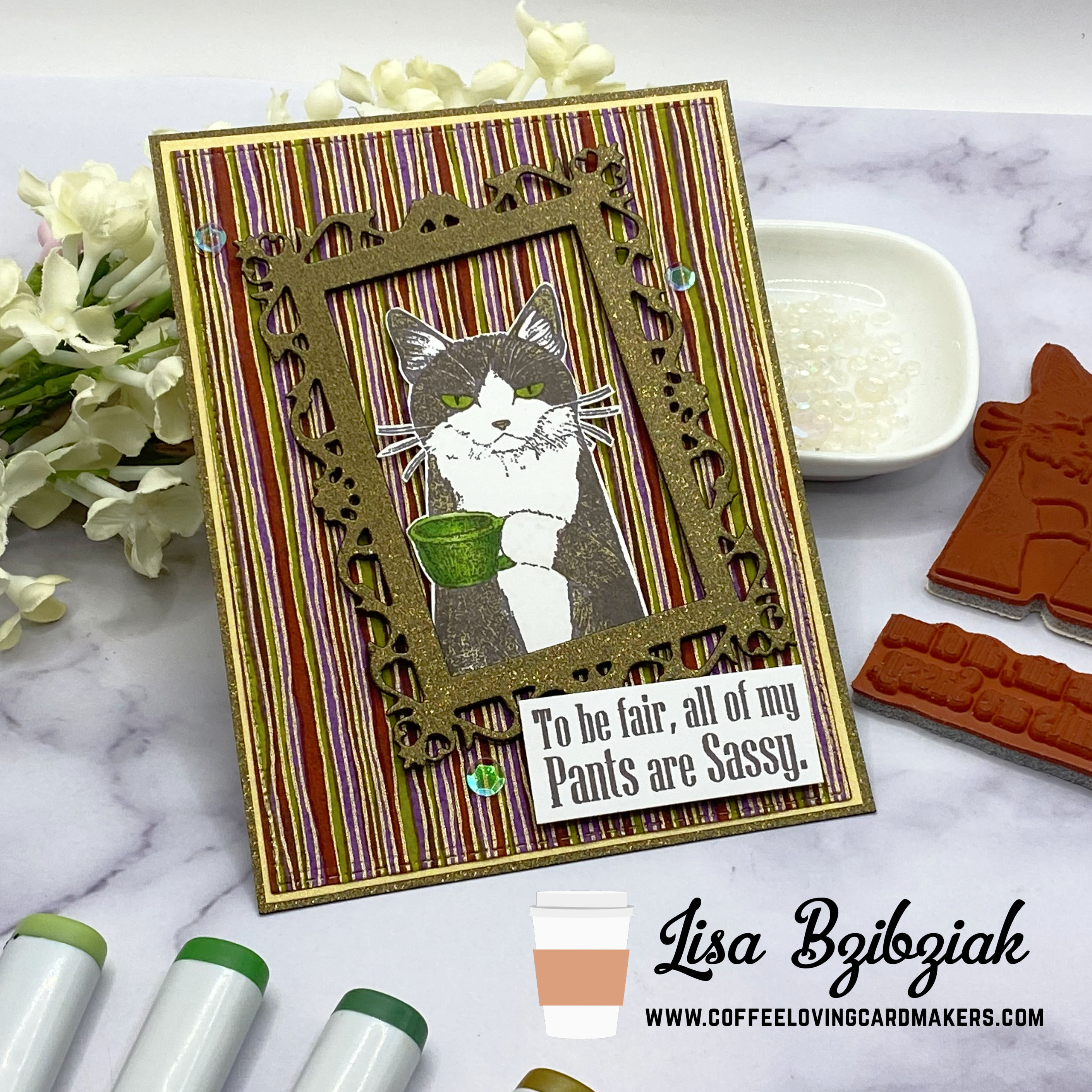 I picked out some fun papers from my latest quarterly Your Paper Insider Box and that adorable cat from Technique Junkies along with a fun sassy sentiment! I knew I had to get that one when I saw it because my husband calls me Sassy Pants from time to time…