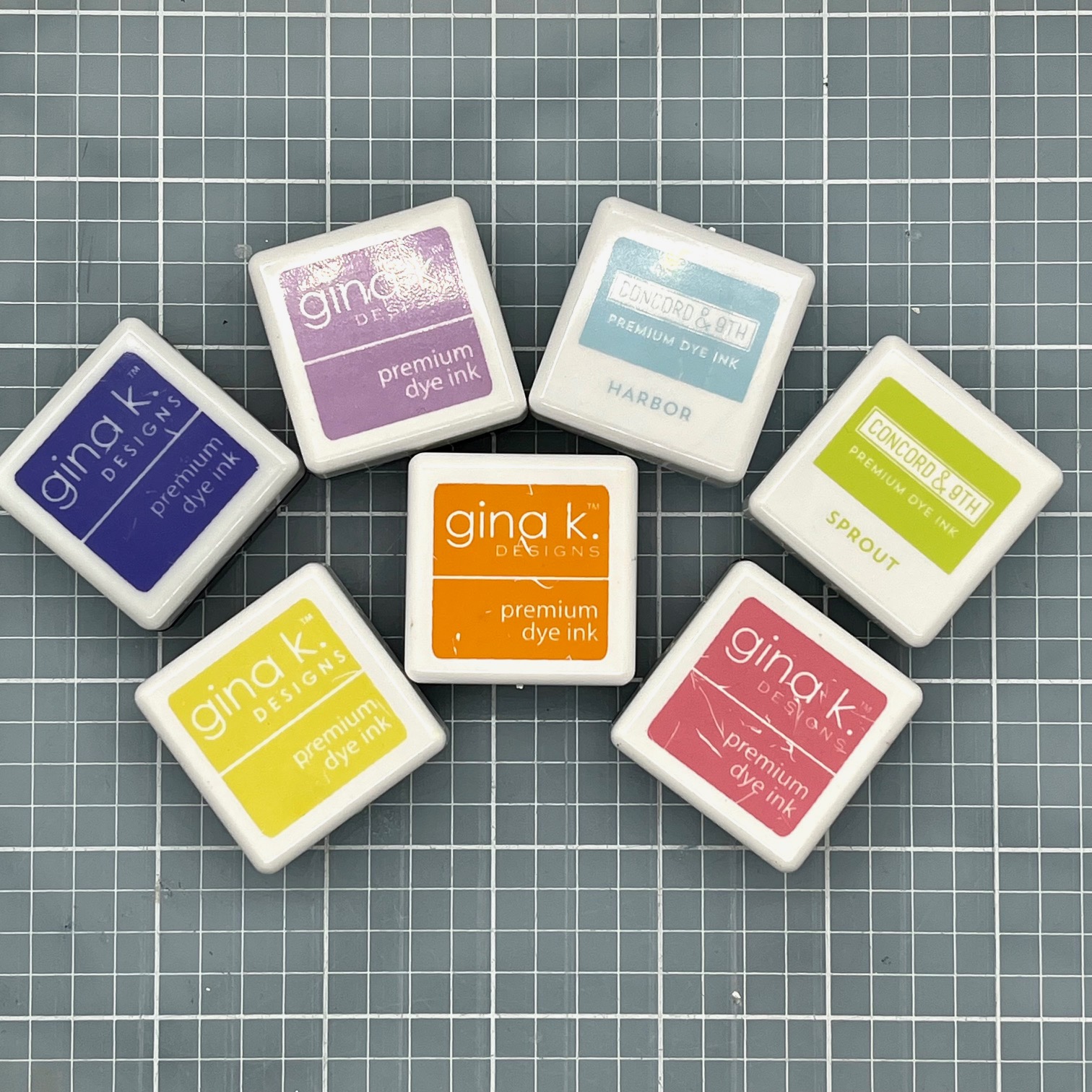 - I used a variety of ink cubes to create my rainbow “steam” : Gina K Wild Wisteria, Gina K Lovely Lavender, Concord and 9th Harbor, Concord and 9th Sprout, Gina K Lemon Drop, Gina K Tangerine Twist, and Gina K Bubblegum Pink