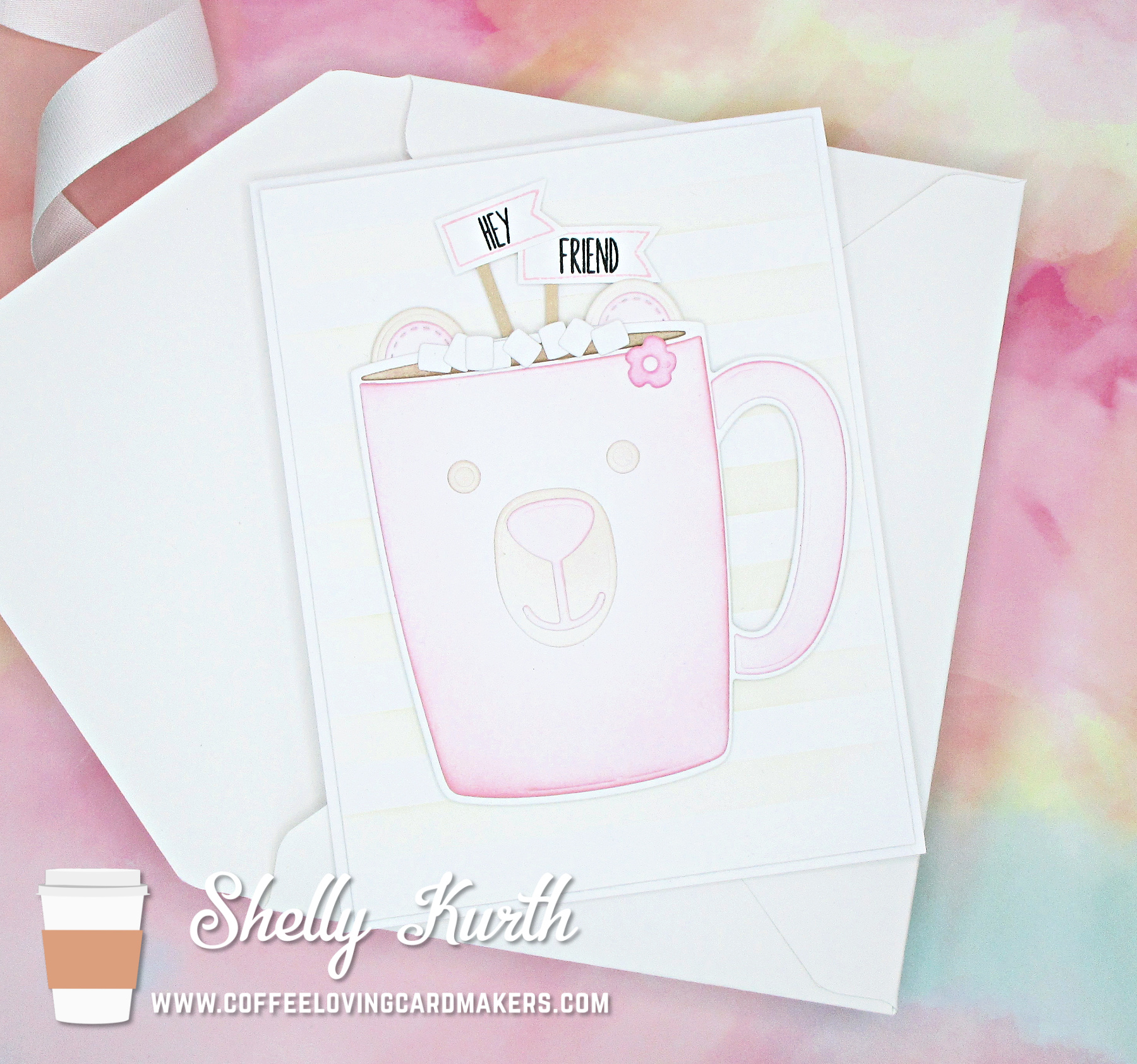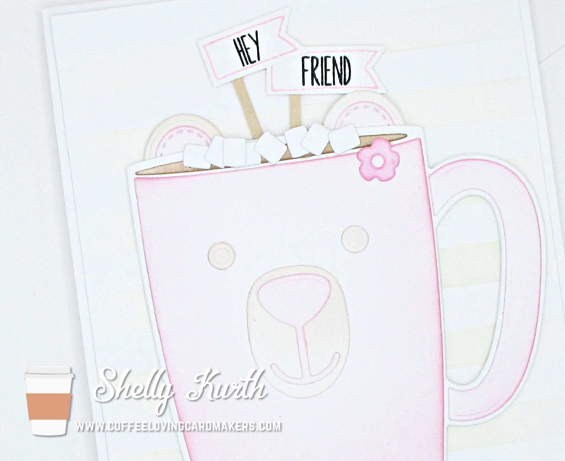 Cute, right?!…I used the Trinity Stamps Beary Cute Layering Mug die set and did some light ink blending with the pieces. After I simply made a ‘bear’ and then before adhering things to my card base, I used Trinity Stamps Stripes stencil with a light brown ink. Lastly, I added a couple little banners/flags and a Hey Friend sentiment. Easy peasy, right?!…