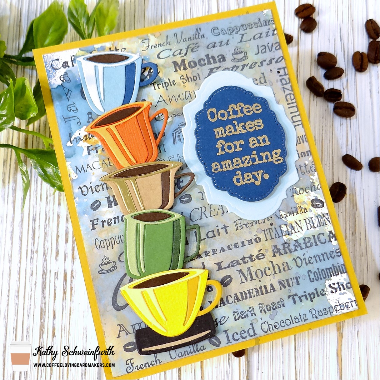 For my card, I created a mixed media background with distress oxide ink pads then stamped over it with an old wood mounted background stamp I had in my stash forever. The colorful diecut cups are from Tim Holtz Papercut Cafe die set (one of my favorite cup sets!) The sentiment, from STAMPlorations Anywhere There’s Coffee set, is gold embossed on dark blue cardstock cut from Divinity Designs Pierced Vintage Labels 2 layered on top of light blue cardstock cut with Divinity Designs Vintage Labels 2.