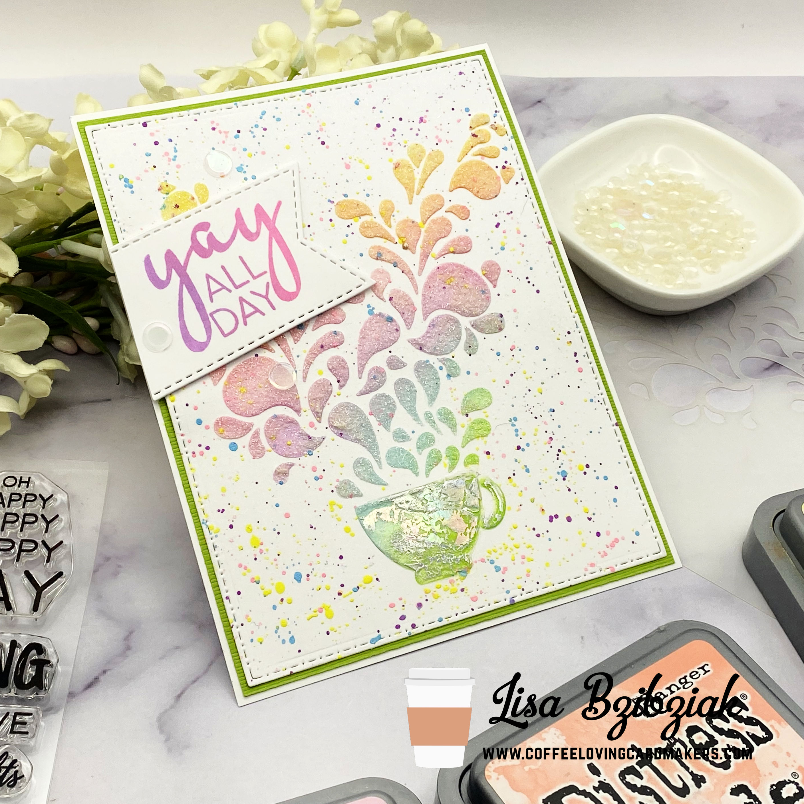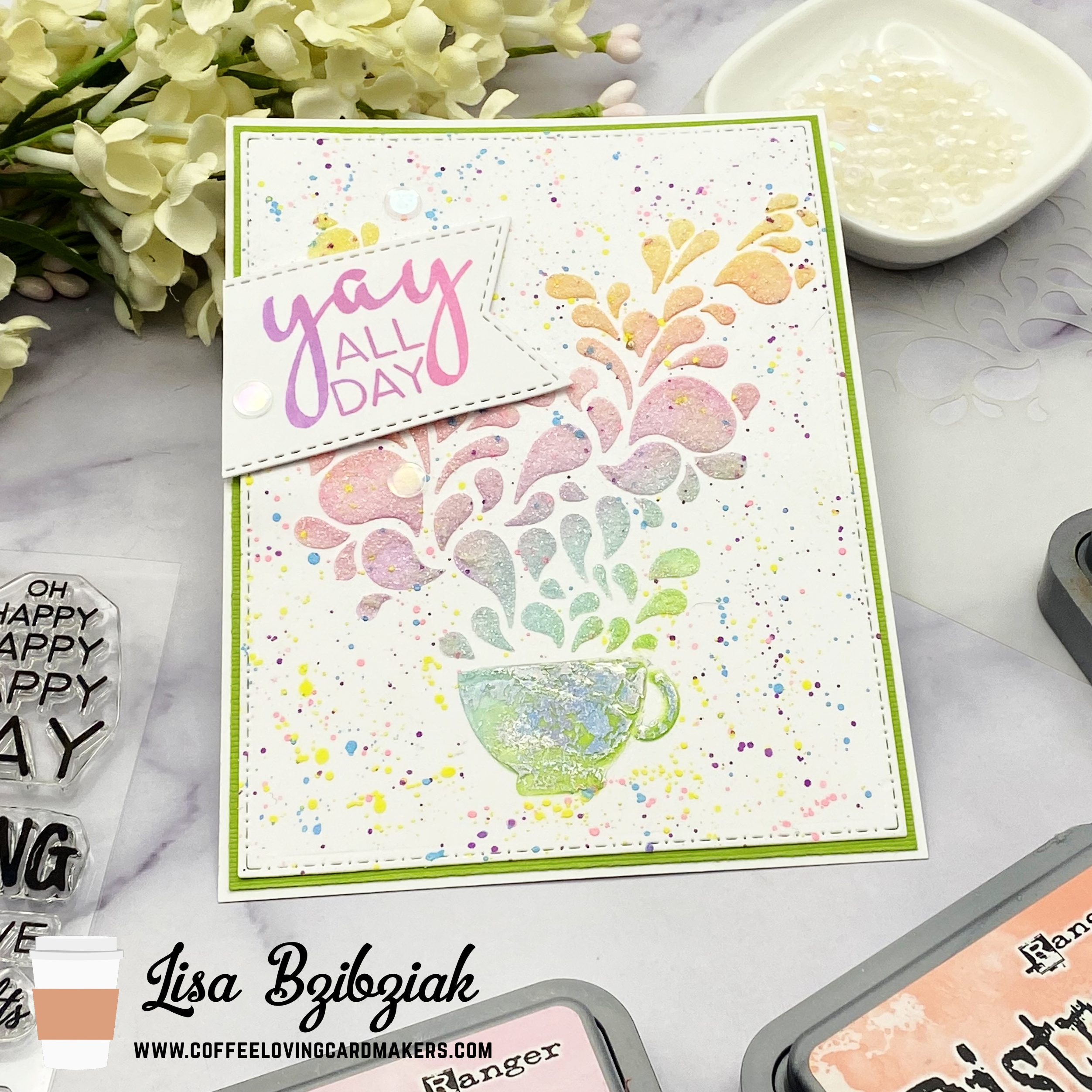 I started by stenciling a white cardstock panel with a rainbow of Distress Oxide colors and the Joyous Cup stencil. Before removing the stencil, I added some Glitz Glitter Gel over that gorgeous swirly “steam” and some Transfer Gel Duo to the cup.