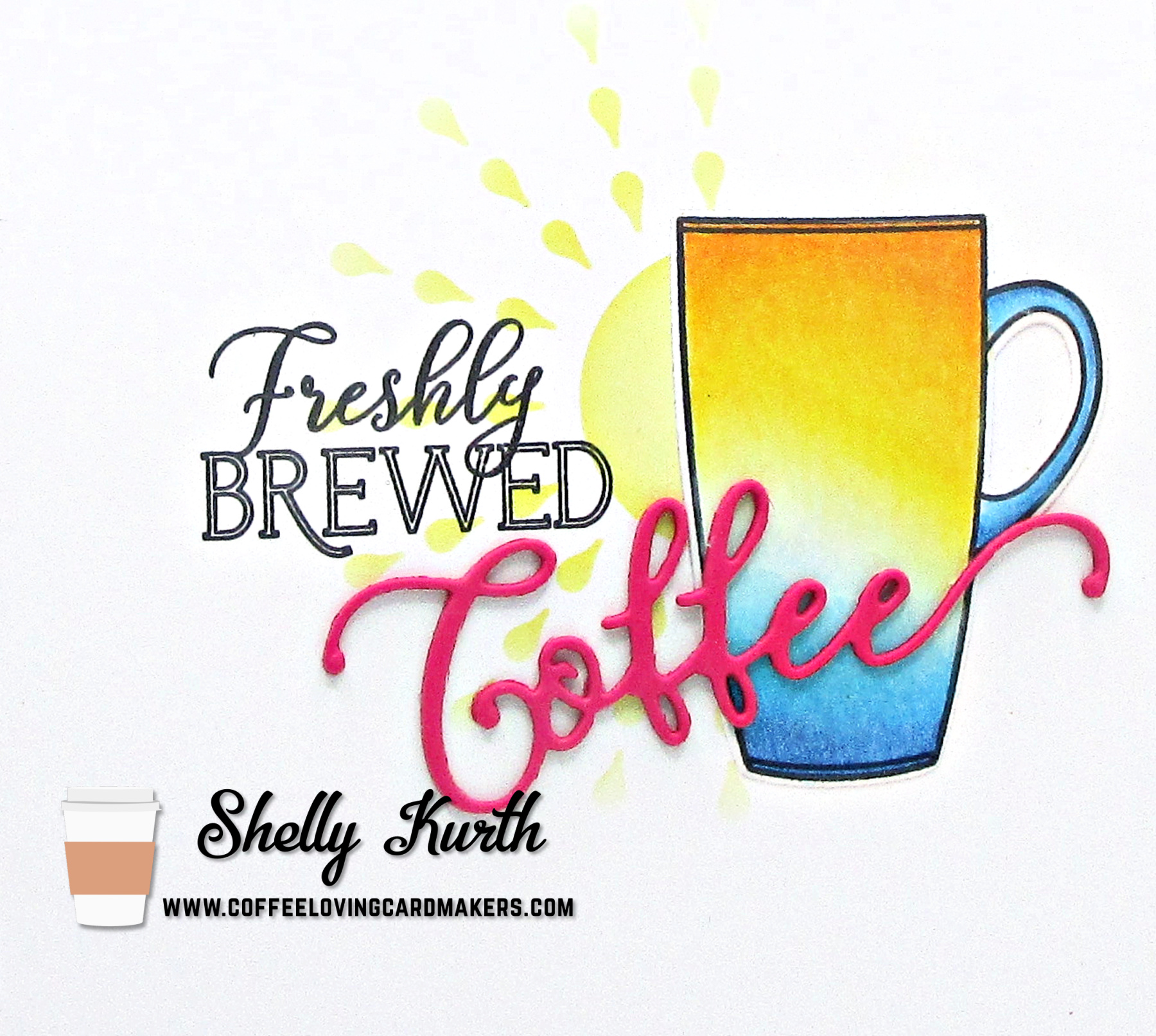With summer in full swing, I thought I’d focus my card with a summertime theme. Some bright, fun colors that feel summery. And of course, you can’t forget the coffee! To color my cup I used colored pencils and then I did a touch of stenciling for the sunshine (which I used an old CAS-ual Fridays stencil for…don’t you miss seeing CAS-ual Fridays around?). Once done, I stamped on the sentiment and then did some die cutting for the coffee and that’s it. Easy peasy, right?!…