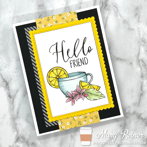 This time I reduced the image a bit and added a different sentiment from the set. I colored it exactly the same but added different patterned paper and washi tape. Which card do you like better?