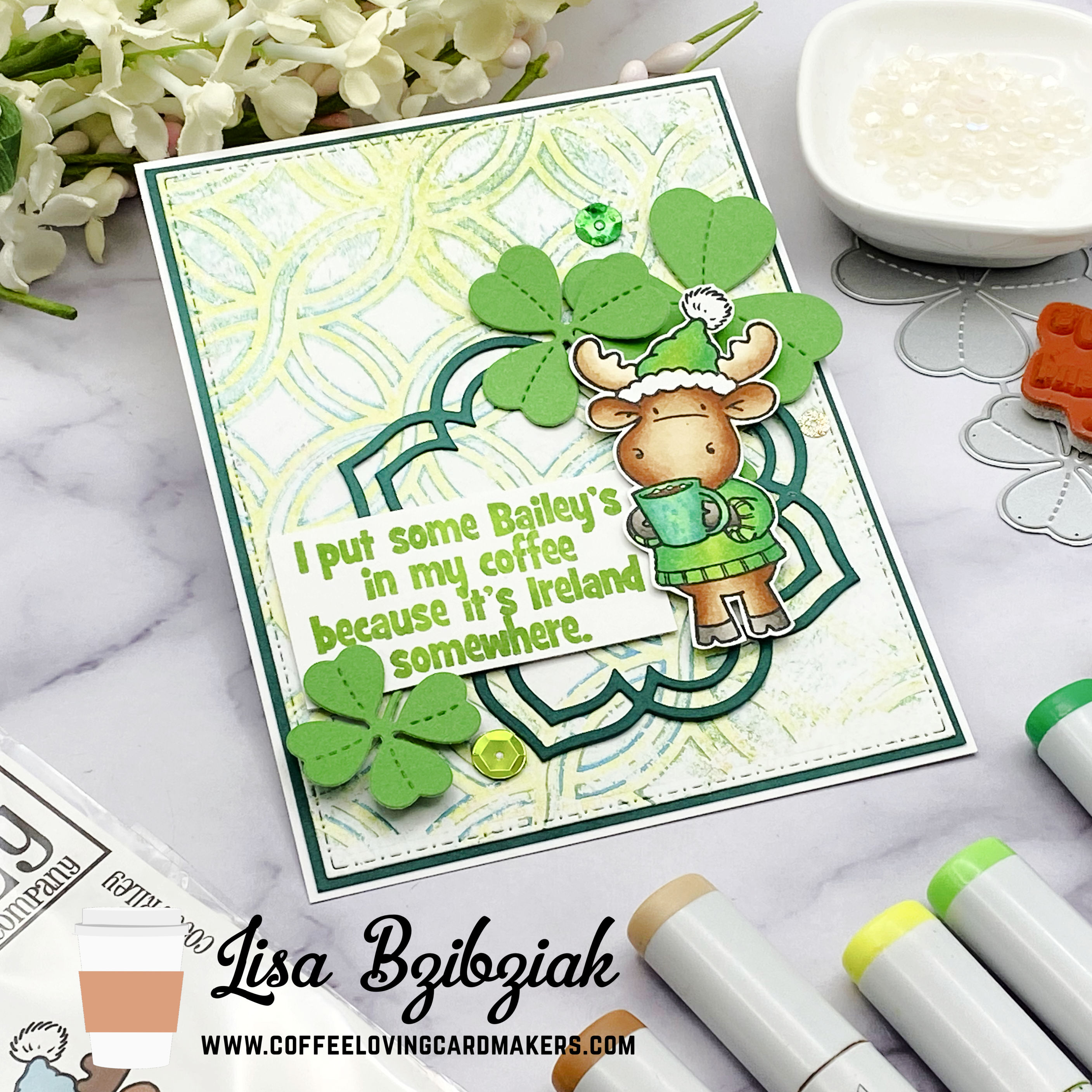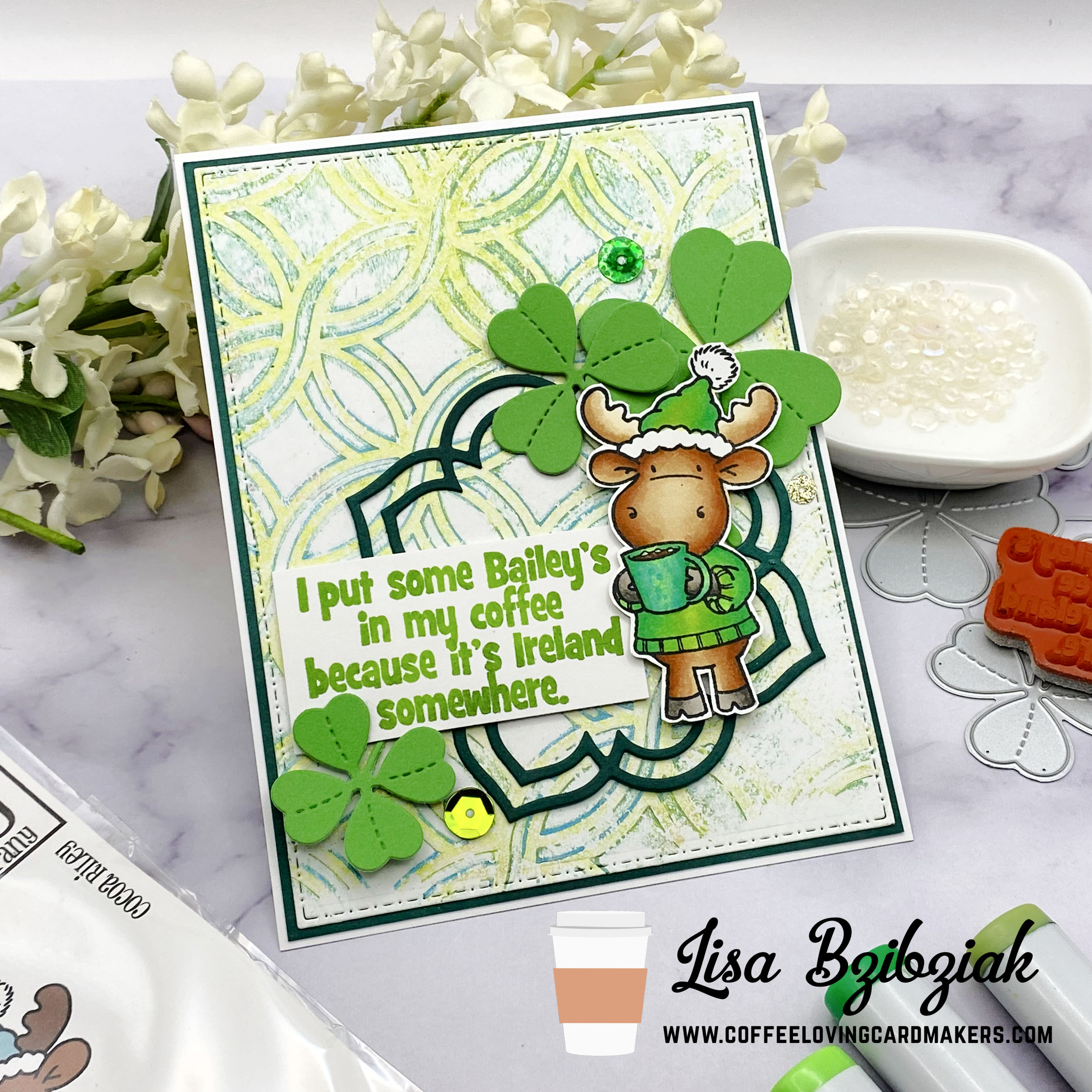 I used a stencil from Rubbernecker Stamps for the background and that fun frame from Miss Ink and threw in a few shamrocks from Lawn Fawn and sequins from Trinity Stamps!