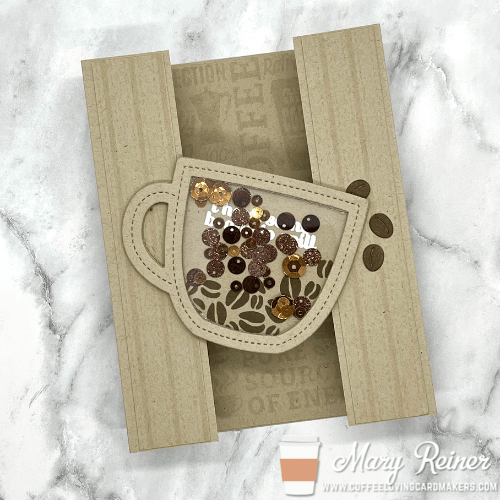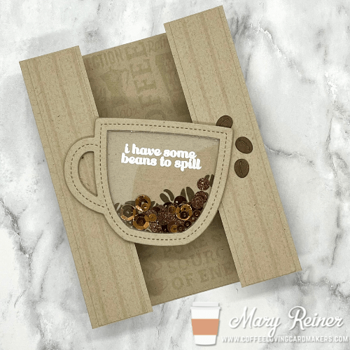 Lastly, I adhered the shaker to the bridge card being careful to only apply glue to the areas that would be touching the front panels. I also added a few die cut coffee beans to spill out of the mug.