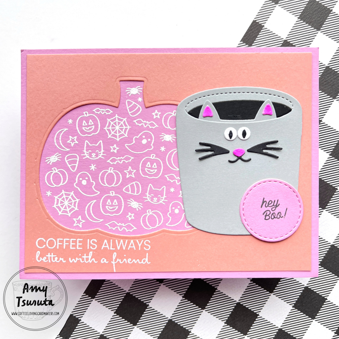 The caffeinated sentiment has been heat embossed in white along with the Boo To You image.