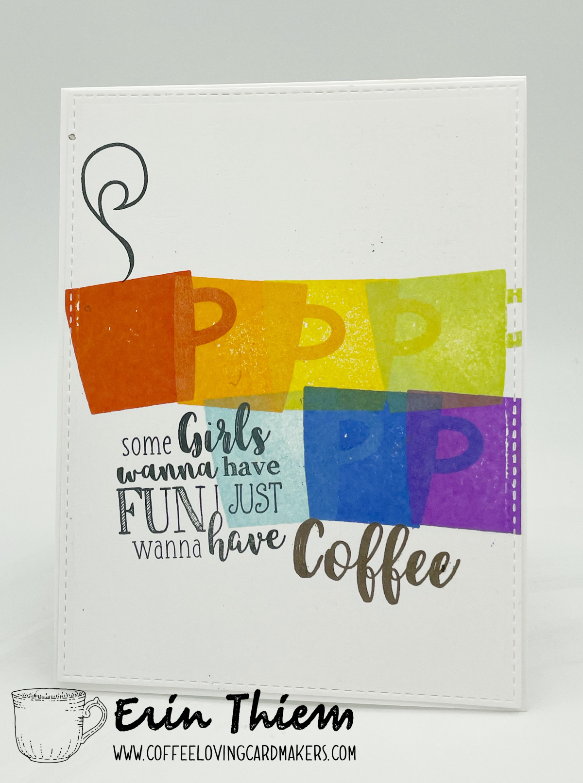 Hello, Erin here for another Creative Chaos fun… my desk gets messier and messier…. today’s cards pair 2 retired stamp sets (SugarPea Designs sentiments and Paper Smooches mugs) with a sparkly The Stamp Market die frame and background by Reverse Confetti. Fun to dig into the stash and see what materializes. My second card uses this week’s Global Design Project challenge of rainbow to add a little color to the otherwise CAS card. Hope your Labor Day weekend fun (if you’re in the US) is full of crafty time… as a campground owner, I’m going to spend my weekend helping campers!