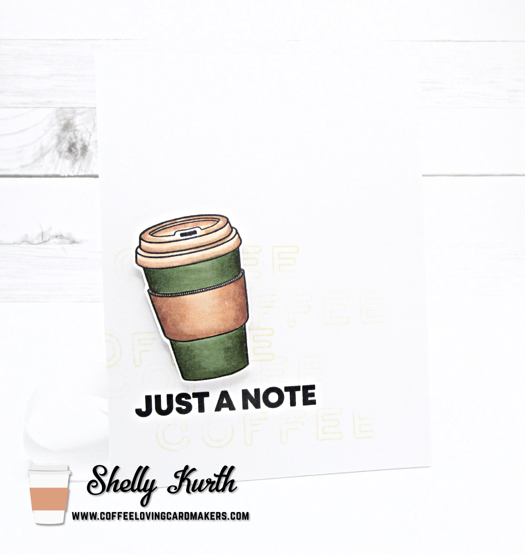 I kept things nice and simple. I added some faint ‘coffee’ words in the background and then did some coloring and fussy cutting for the coffee cup (I also added some foam tape on the back). Then stamped on a bold ‘just a note’ sentiment and that’s it. Easy peasy, right?!