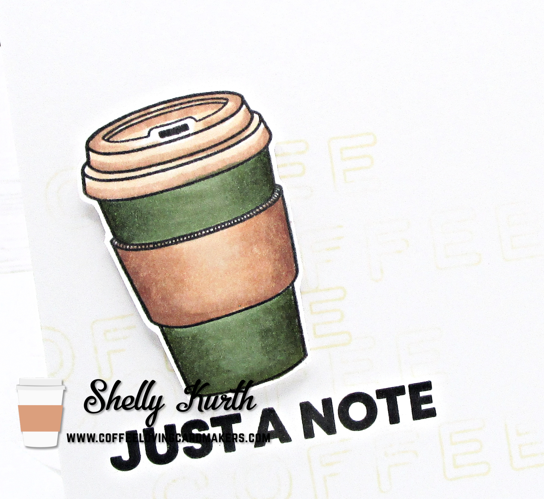 I kept things nice and simple. I added some faint ‘coffee’ words in the background and then did some coloring and fussy cutting for the coffee cup (I also added some foam tape on the back). Then stamped on a bold ‘just a note’ sentiment and that’s it. Easy peasy, right?!