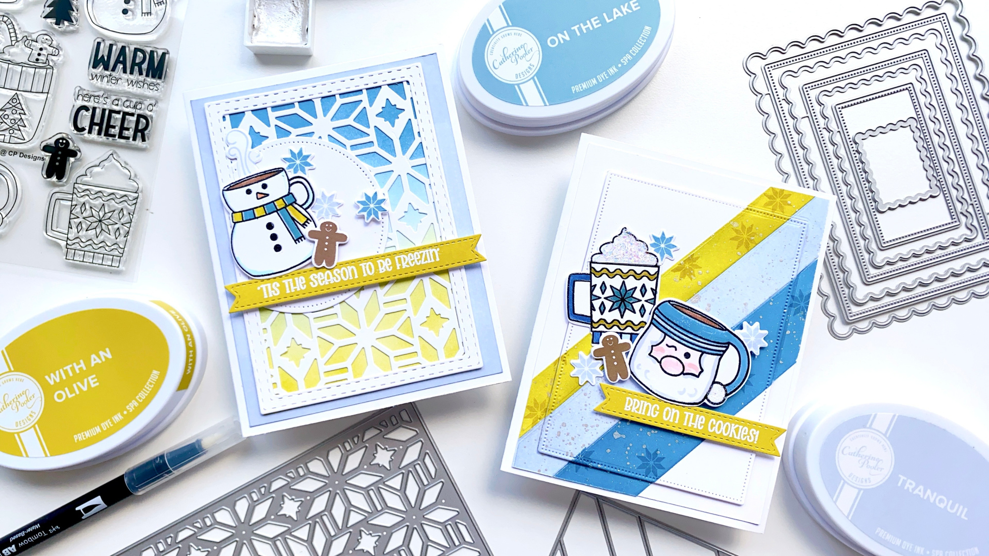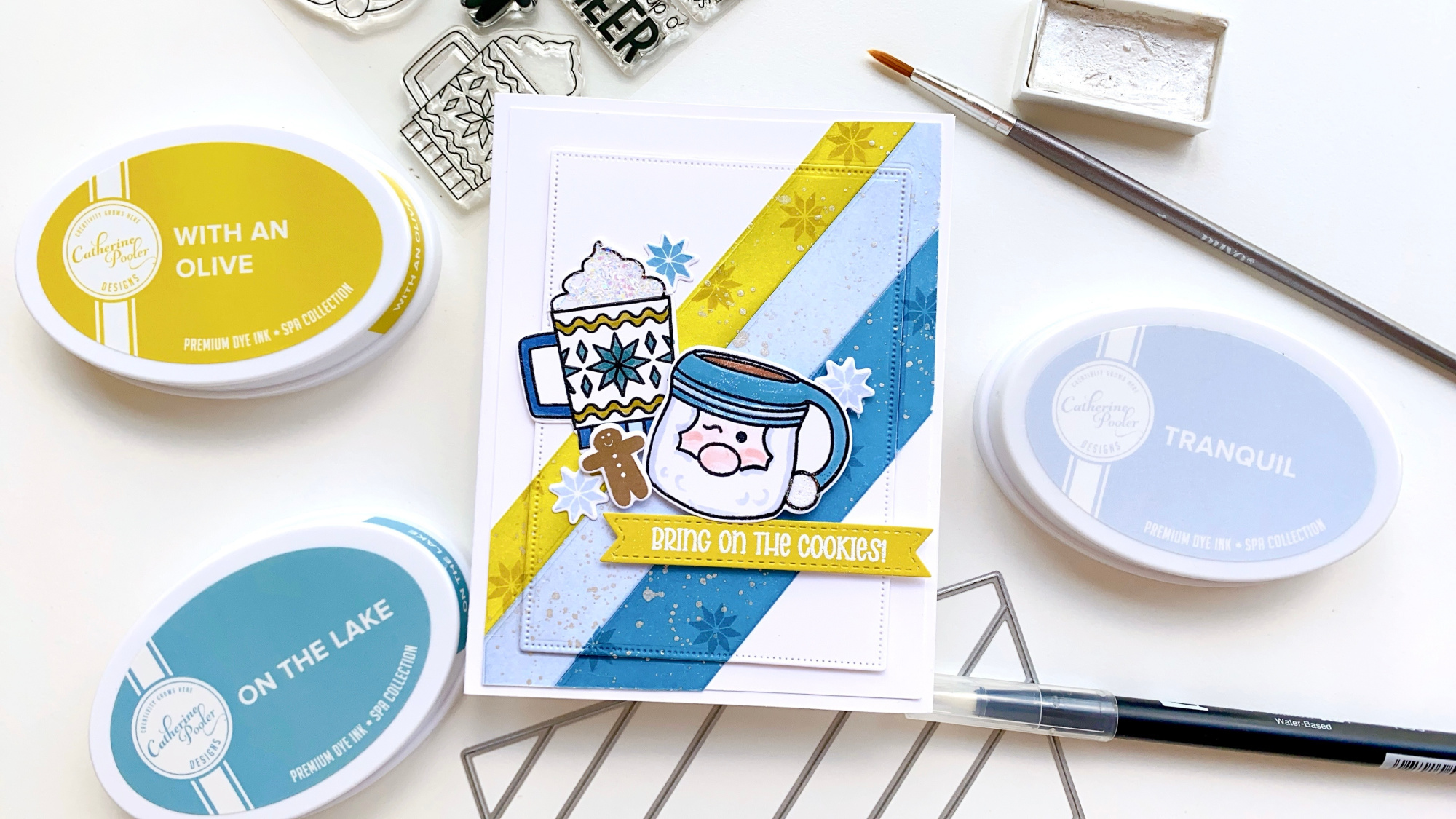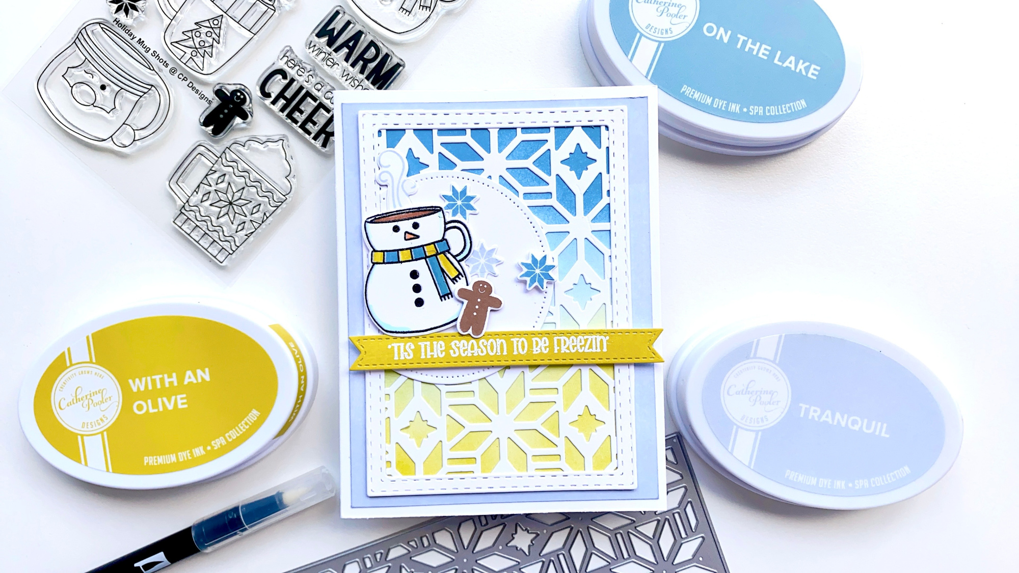 @createncoffee joining in with my friend Amy for a fun Color Combo Challenge! As the Director of Product Development at Catherine Pooler Designs, I am all about color. It’s one of my favorite parts of the job to help develop our ink line and pulling together color combos for our patterned papers. For this challenge, Amy and I are using the New Spa Ink Colors- With an Olive and On the Lake, along with Tranquil for a pretty, wintery analogous look.