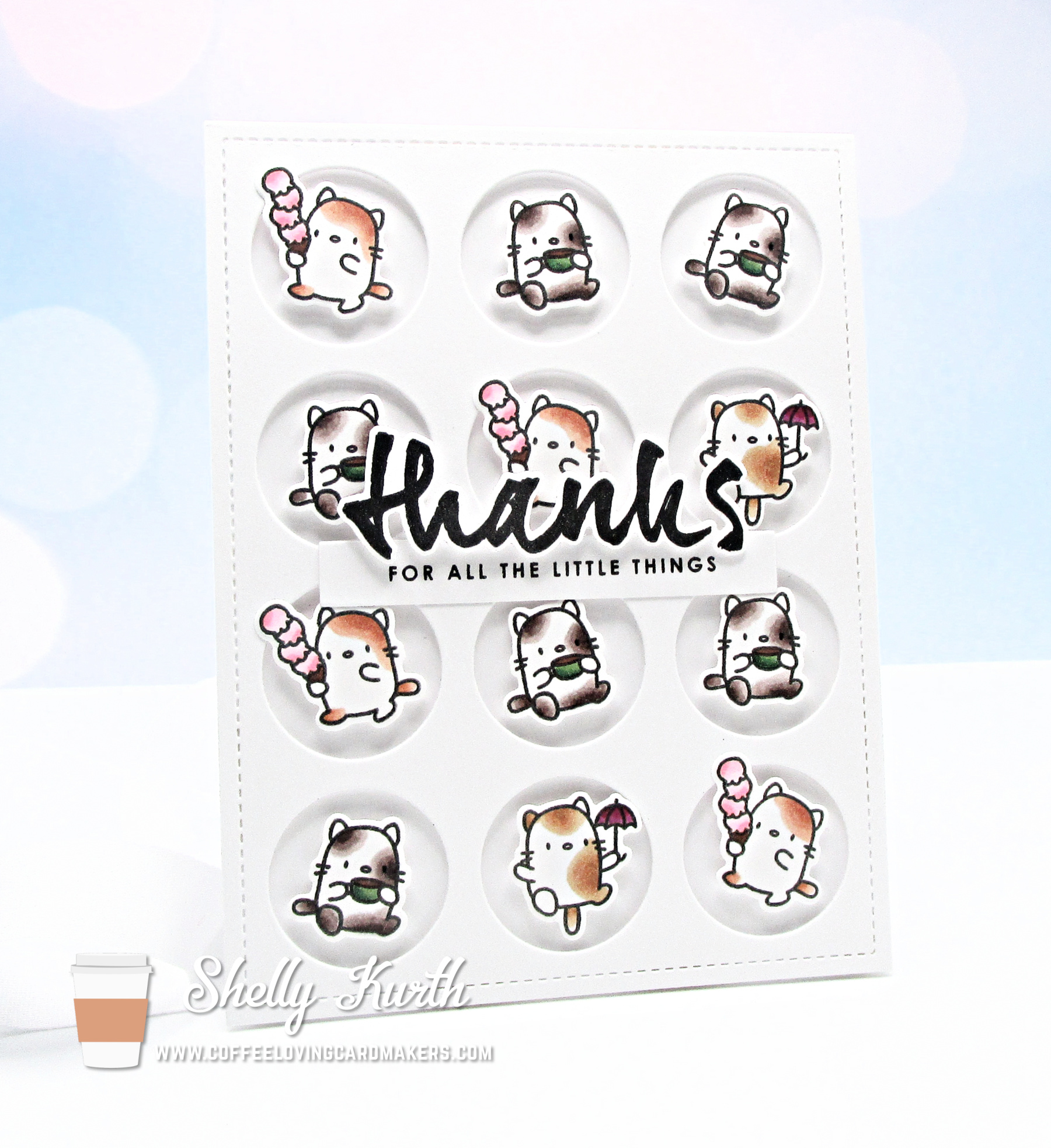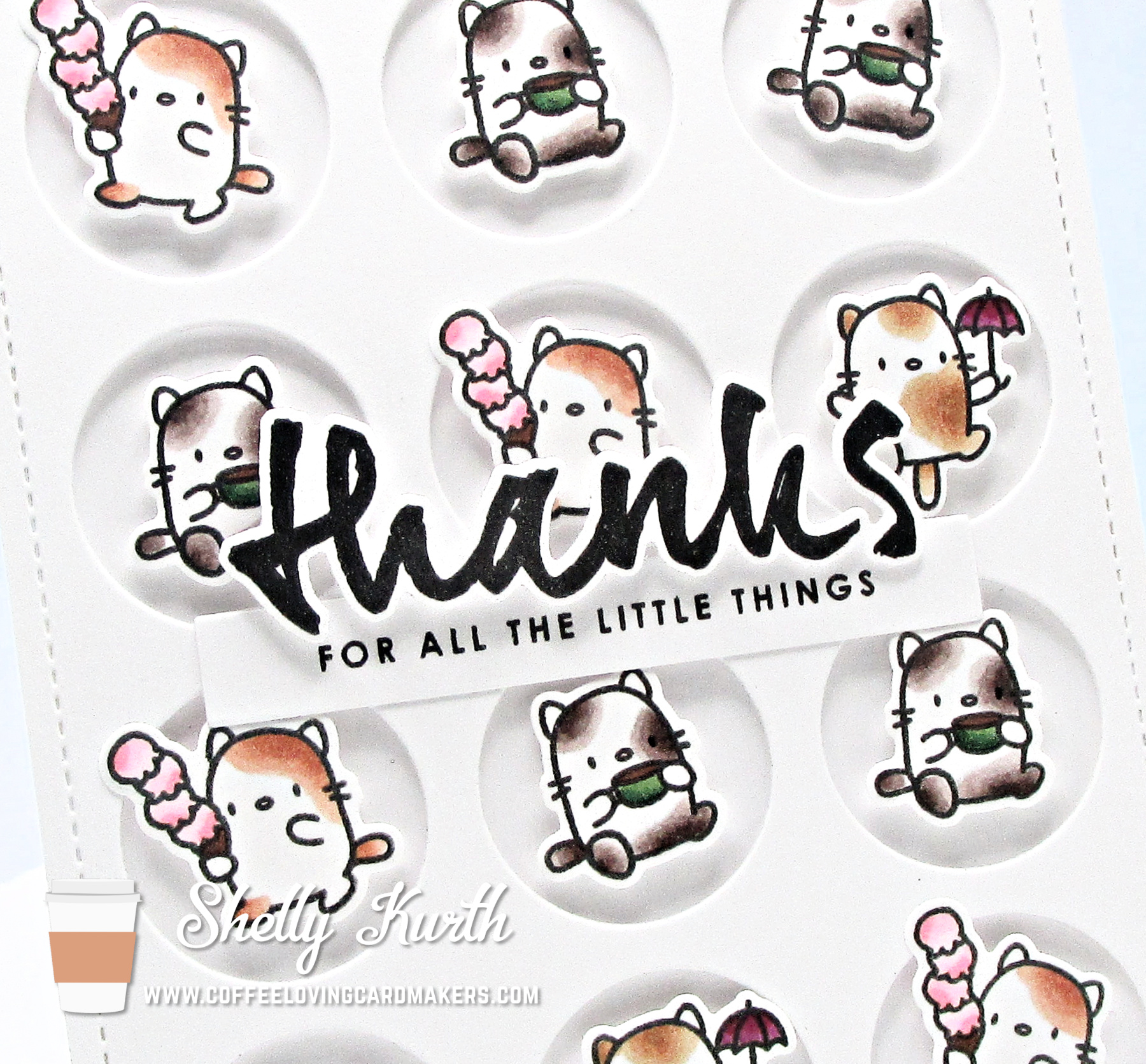 I had so much fun making this card! Aren’t those little cats adorable?!…I kept things relatively simple, just some easy coloring with Copic markers and then some die cutting. Easy peasy, right?! 🙂
