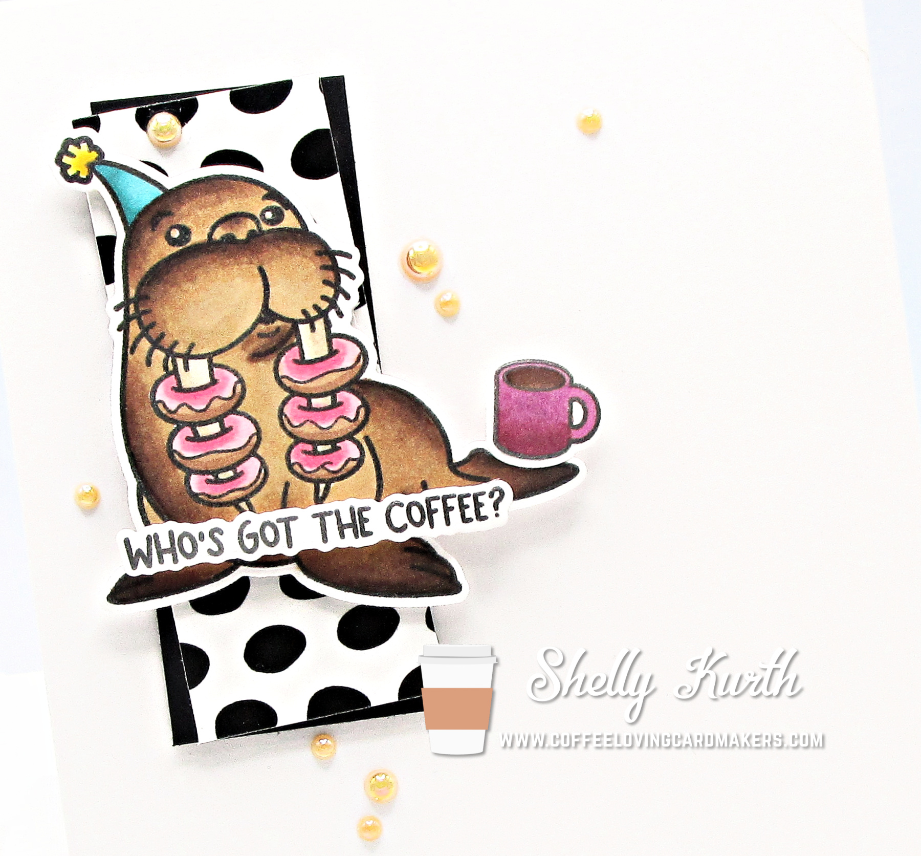 I couldn’t resist that walrus, he’s just too cute! And I’m thinking he forgot that he had his coffee all along?! (lol) I think we’ve all done that before, right?!…I did some coloring with Copic markers and then used the matching dies with the images. I added a touch of patterned paper for a little bit of a ‘pop’ and a sprinkling of pearls. That’s it. Pretty simple, right?!…