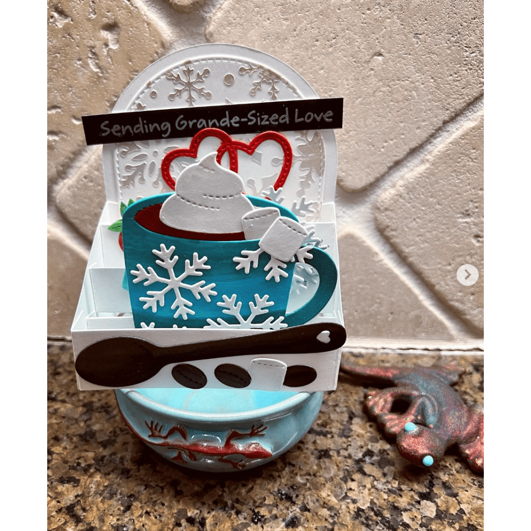 I love how Liz put together the cocoa mug, cream, marshmallow, hearts, and snowflakes together into this fun 3D card! It is a sweet way to send a warm hug and love to others in the Winter season for sure.
