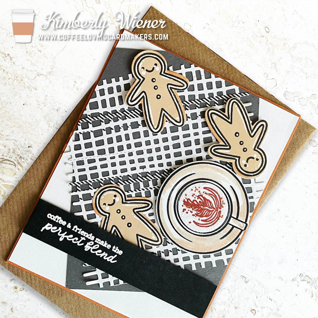 I used Concord & 9th cardstock in Black, Mushroom, and Cayenne. The Honeybee Stamps Honey Cut Burlap A2 die was cut with Honey Bee Stamps Bee Bliss (retired) 6×6 paper pad. The sweet gingerbread people are from the Ellen Hutson Julie Ebersole’s Cozy Cuppa Stamp and die set. The coffee cup, latte swirl, and sentiment are all from the Photoplay coffee & Friends stamp set. Inks are Memento Tuxedo Black, Concord & 9th Cayenne for the latte swirl. Copics used: E04, E43, E33. Detail touches in white gel pen were added. To top it off, I added a white embossed sentiment strip and Impress sparkle glitter around the latte swirl for a fine twinkling detail.