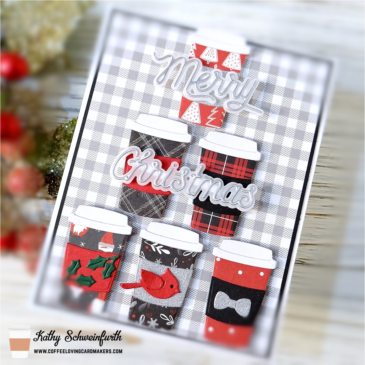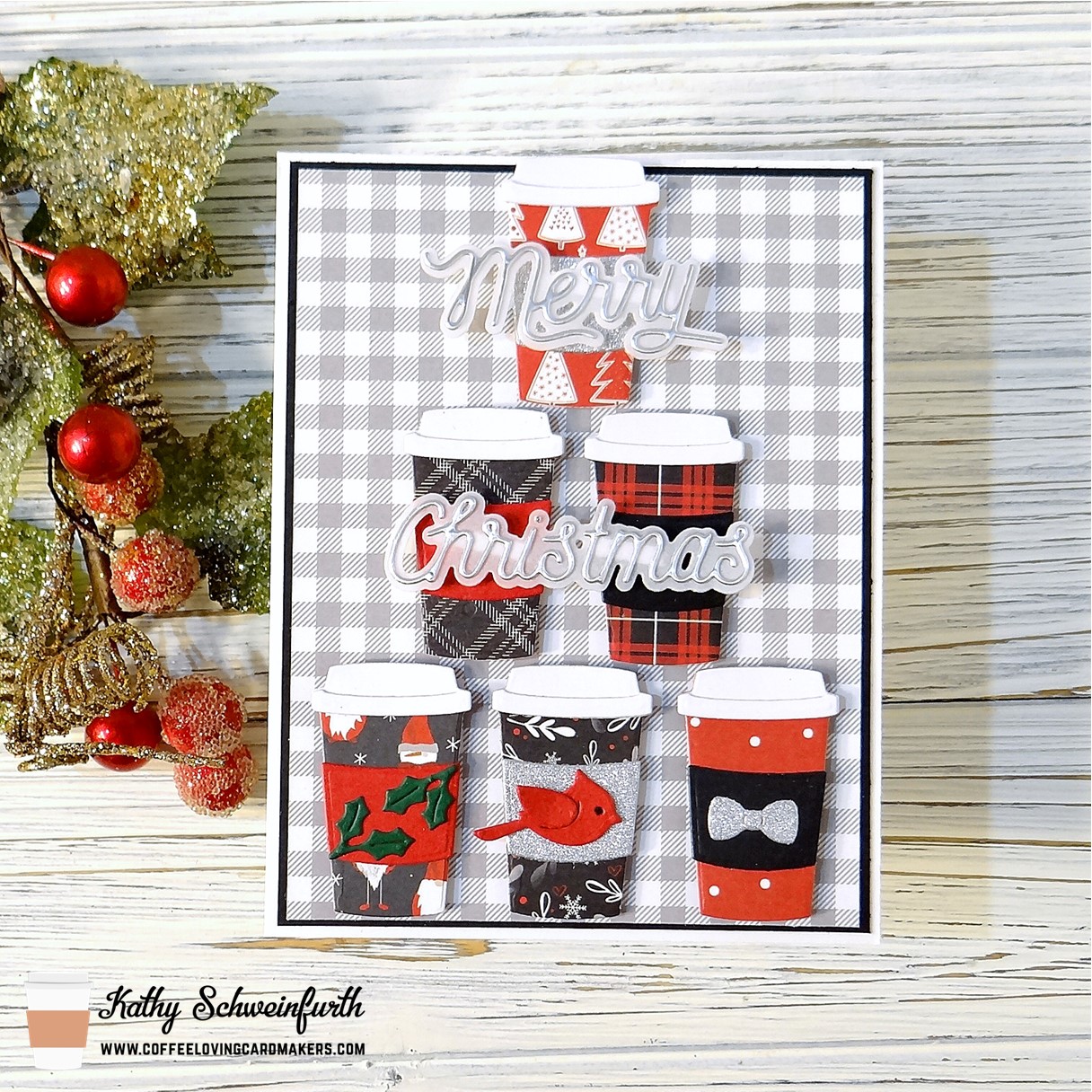 ‘O Coffee Christmas Tree!  One of these years, I’m going to have my Christmas tree be decorated with coffee cups!  My card features these mini to-go cups created with a Trinity Stamps die I received for free from making a purchase there — how fun is that!  The little decorations came from Lawn Fawn’s Build-a-Snowman die set and the sentiment is Divinity Designs’ Merry Christmas & Layer 6.