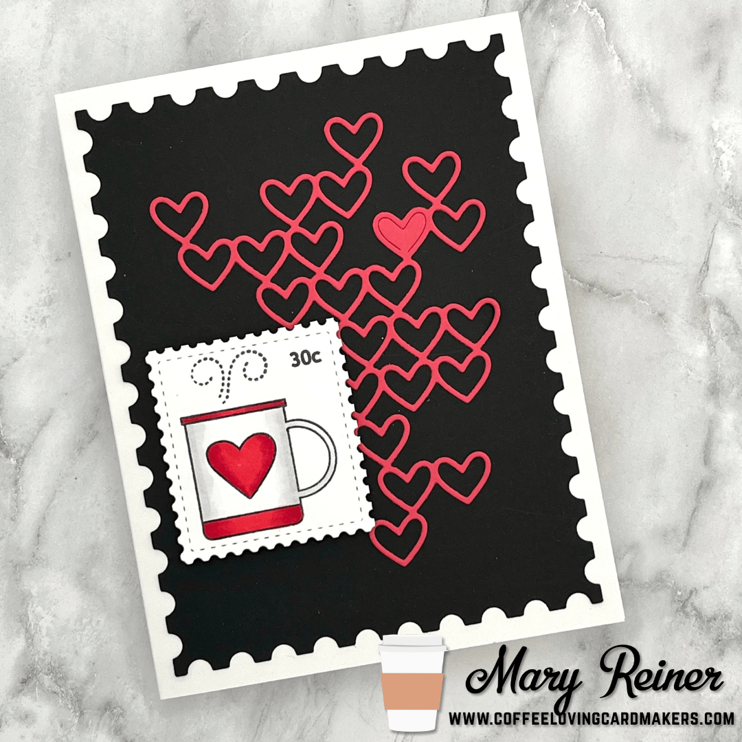 I wanted to keep the postage theme going, so I cut a black panel with a Catherine Pooler Postage Stamp die. Then I added the pretty heart pattern from Simon Says Stamp. I love the texture this adds to my card. To finish it, I adhered and popped up one of the leftover little die cuts.