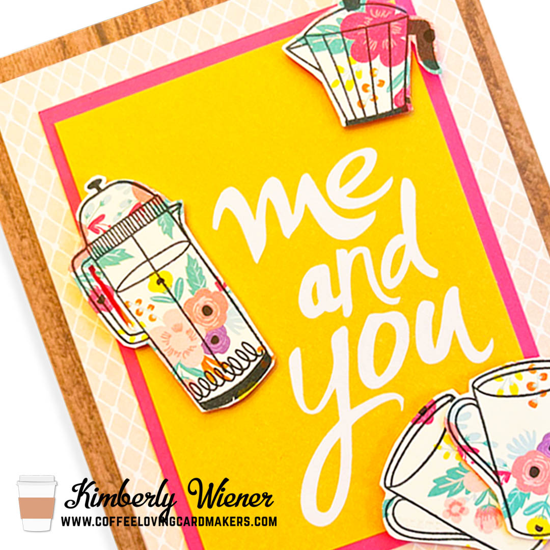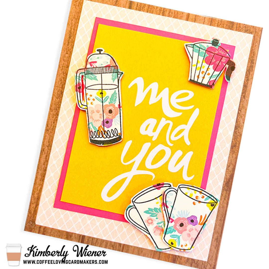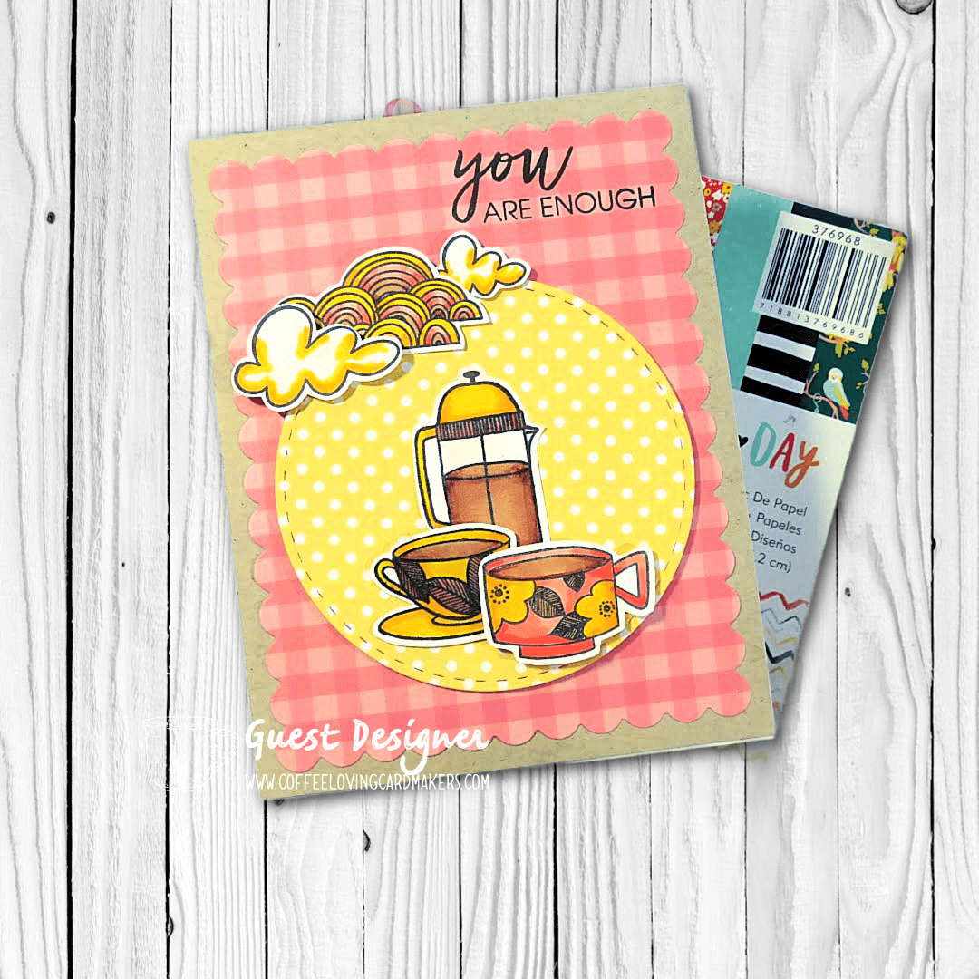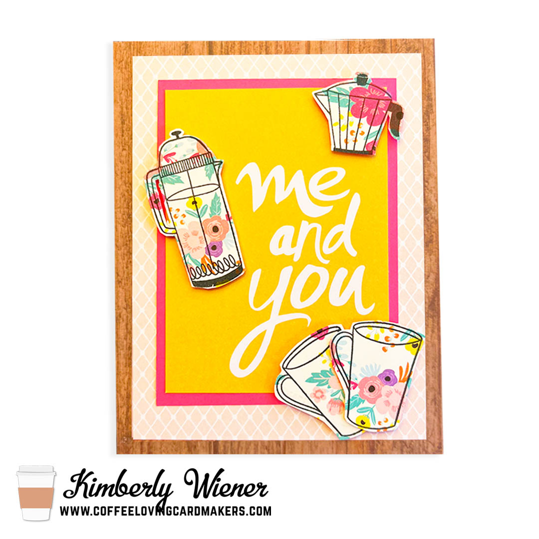 My card features some Ellen Hutson sets that are retired, but so fun! I paired them with a Pink and Main Circle Die and Catherine Pooler Scallop die.  My main goal creating this was to use these fun coffee stamps and was wanting to use yellow, salmon and brown for my colors.  I think it turned out pretty fun!  Kim always inspires me with her use of colors, so I can’t wait to see what she whipped up!