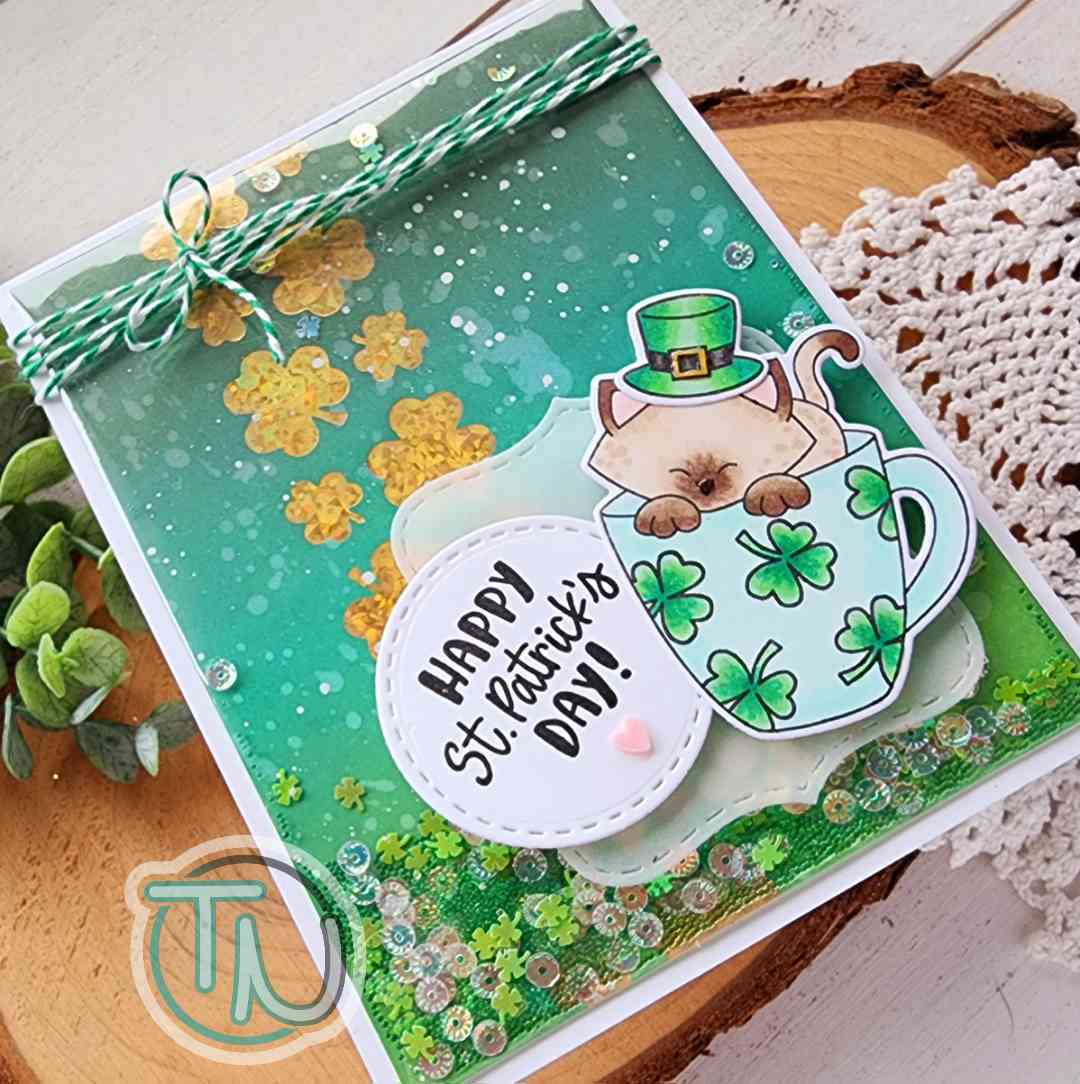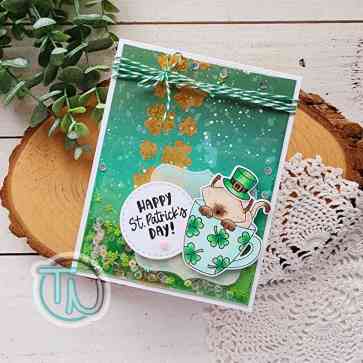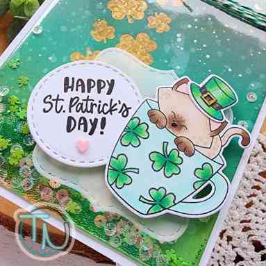 I started by stamping the Newton’s Mug image on copic paper. Then I stamped it a second time on a full-stick post-it and cut the mug out so I had a mask. I pulled a shamrock image from Newton’s Lucky Clover and stamped it all over the mug. I also stamped the cute hat from that set at the same time. After removing the mask I colored everything with my copic markers and used coordinating dies to cut them images out.