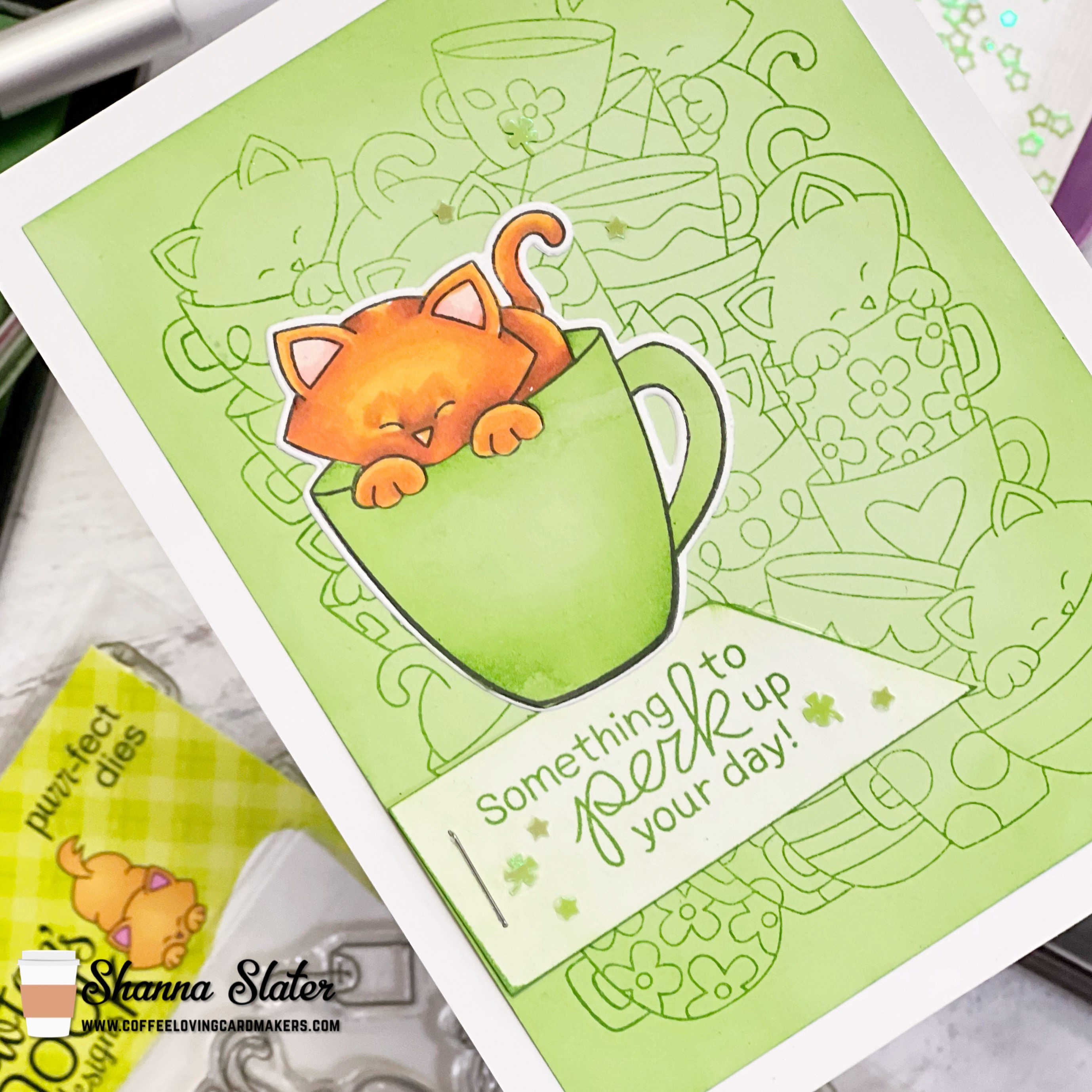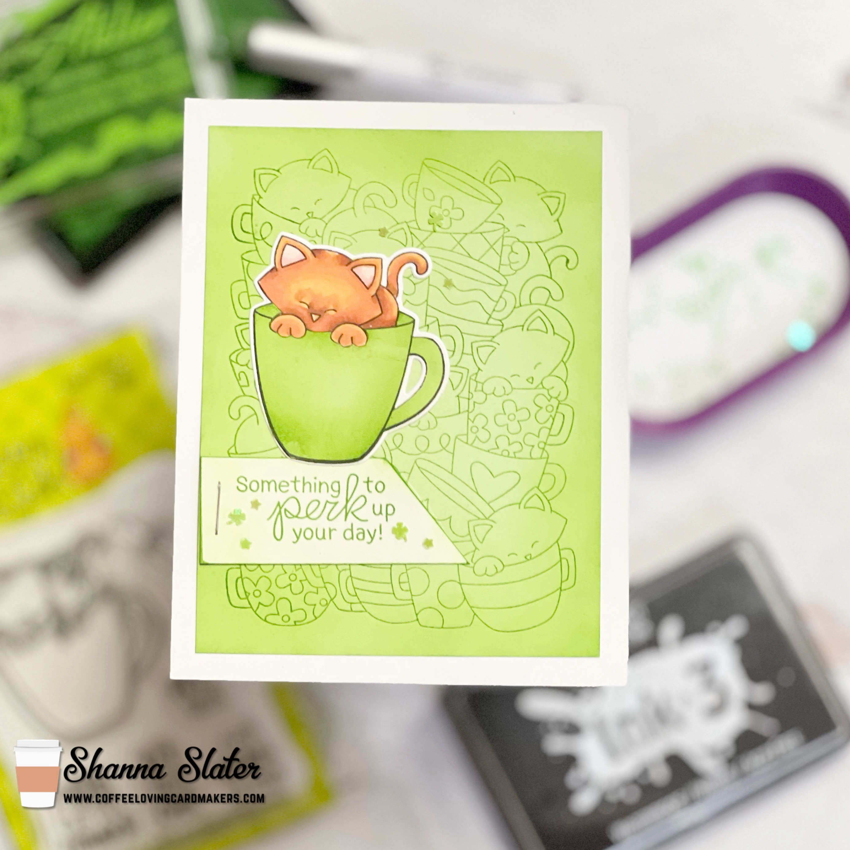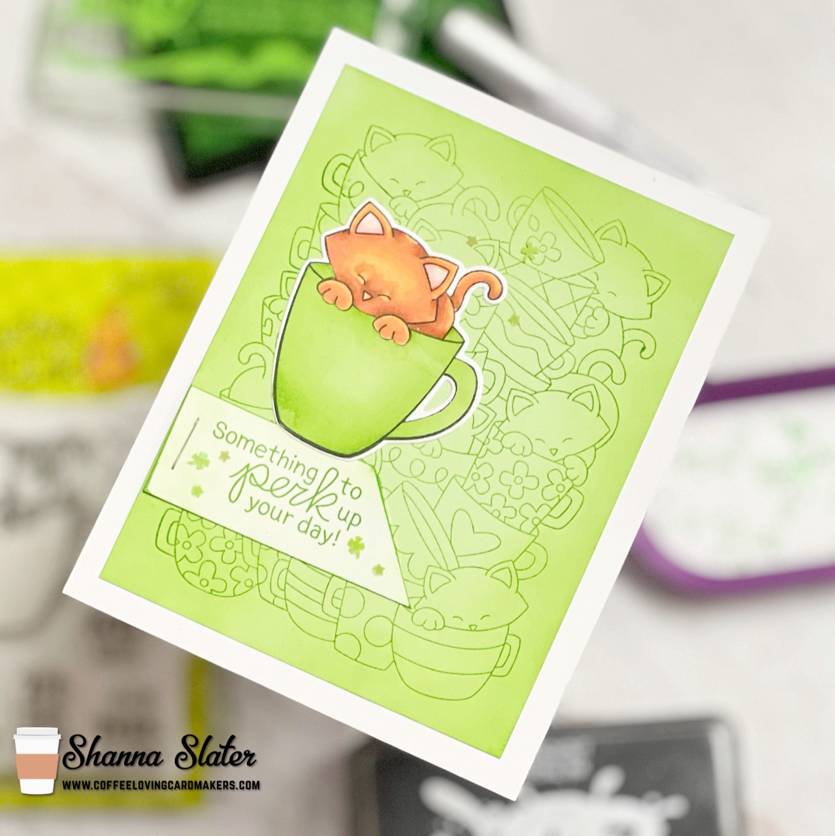 For mine I went with the same Newton’s Mug stamp and die set–but paper pieced the mug with the same shade of green I stamped the Caffeinated Cats stamp for my background.  To add a little contrast, I used super sponsor Ink on 3 Atelier Ink in Goddess Green and an Bitty Blending Brush from The Rabbit Hole Designs to darken the edges and also stamp the sentiment!