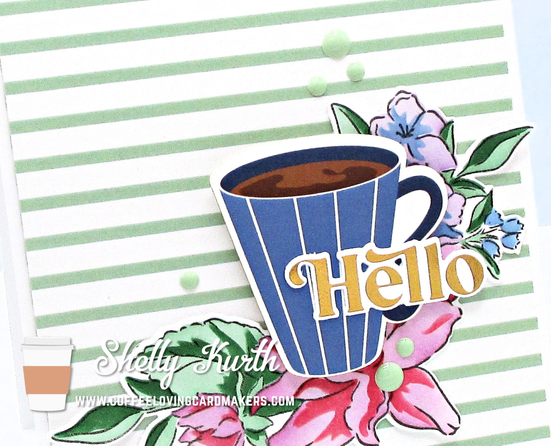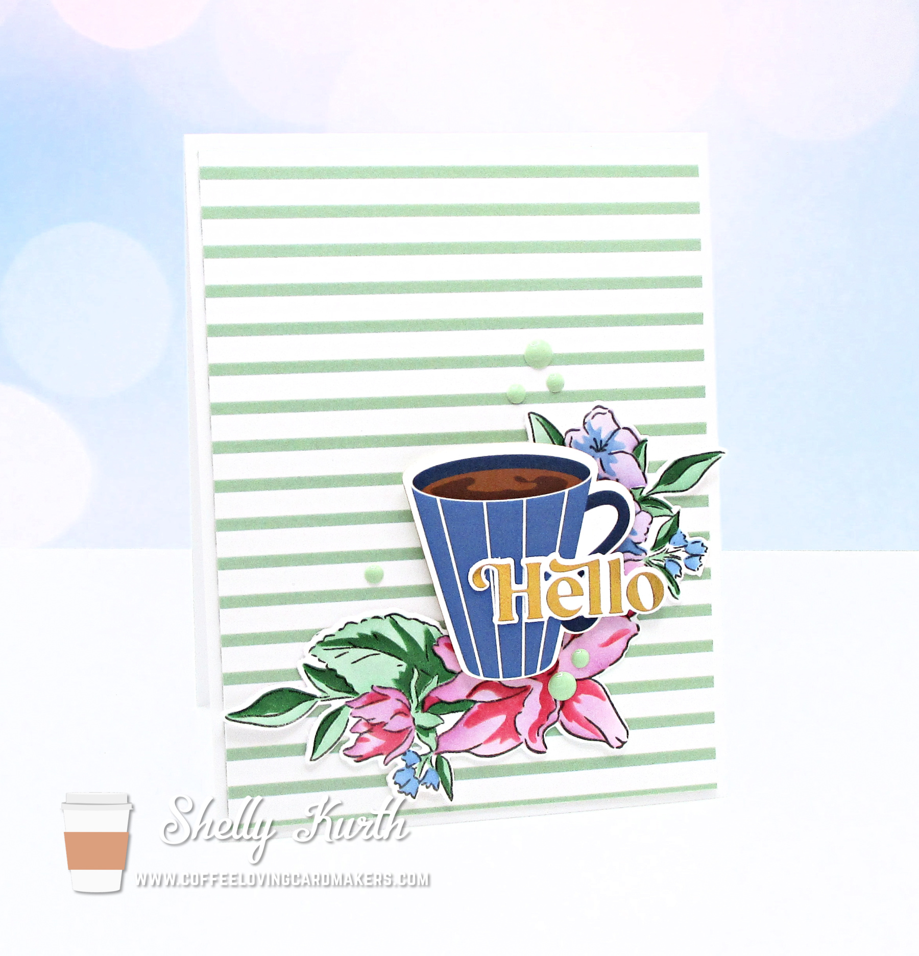 I kept things simple. Believe it or not, I didn’t have to stamp or die cut or even ink anything! If you’re anything like me, you tend to have ‘left overs’ from not using things when you thought you were. And you’re not going to throw things out, so you keep them in a container/box, right?!…so, everything was already made and that coffee cup, Amy was so nice to send that to me in a card and I finally put it to use. (Thank you again, Amy.) Like I said, simple. To finish things off, I added some patterned paper for the background and a touch of enamel dots. Isn’t it nice when a card just comes together so easily?!…