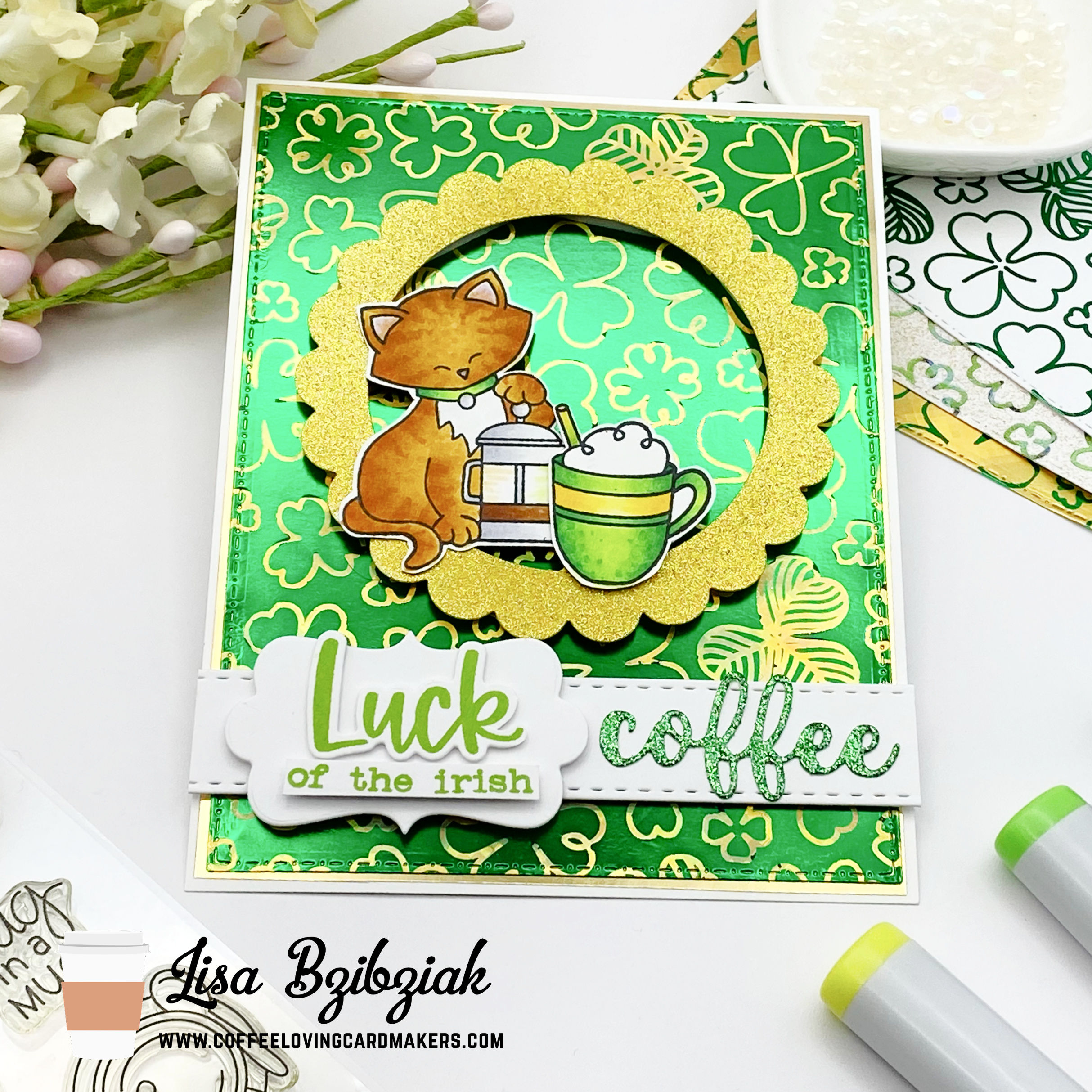 I have a confession! I’ve never had Irish coffee! I’ve just never been anywhere at the right time or where I know they make them… I guess this should be one of my fun goals if I’m any kind of a coffee lover! This background was created with a negative sheet (the green) of foil and some toner paper and then I ran it through a second time with gold.