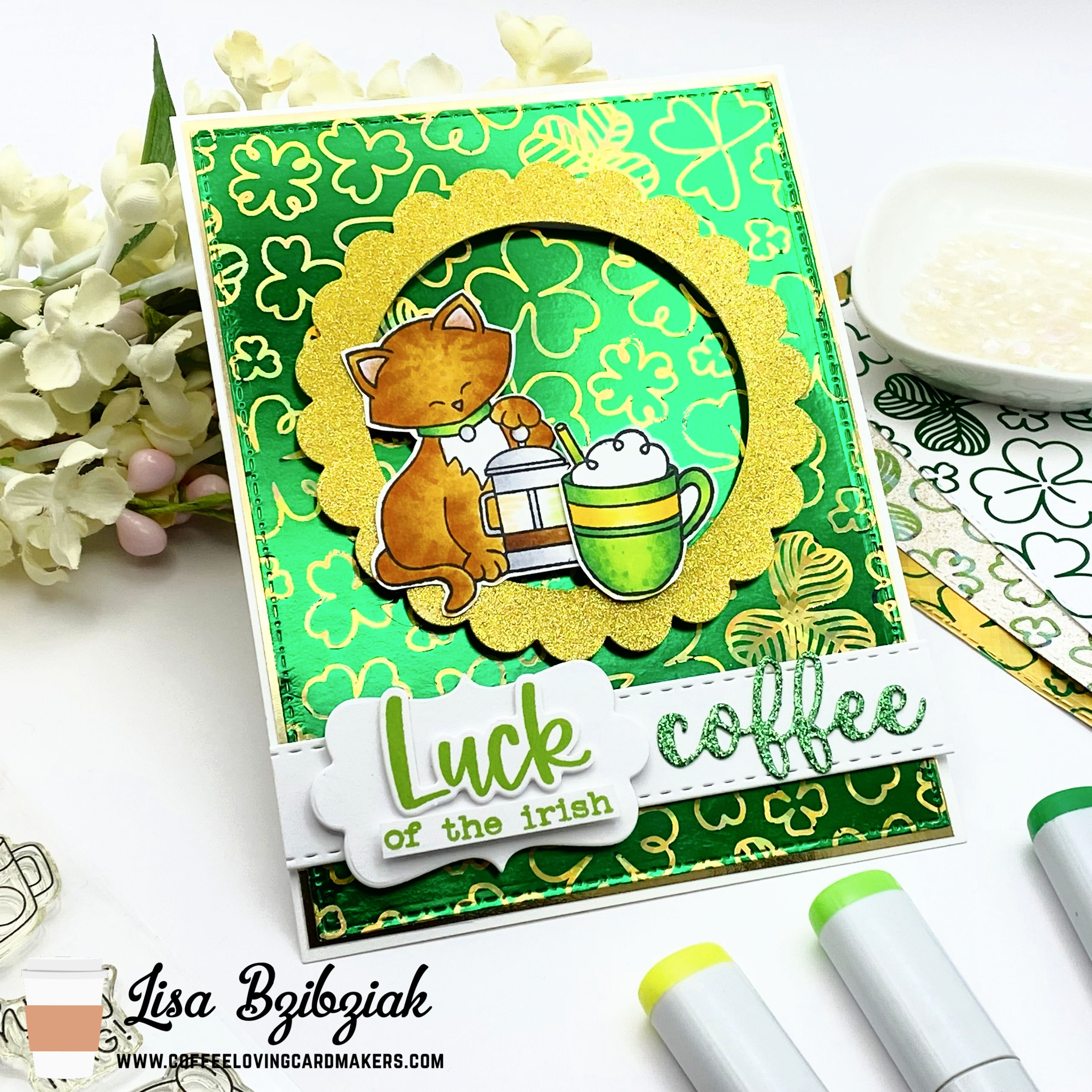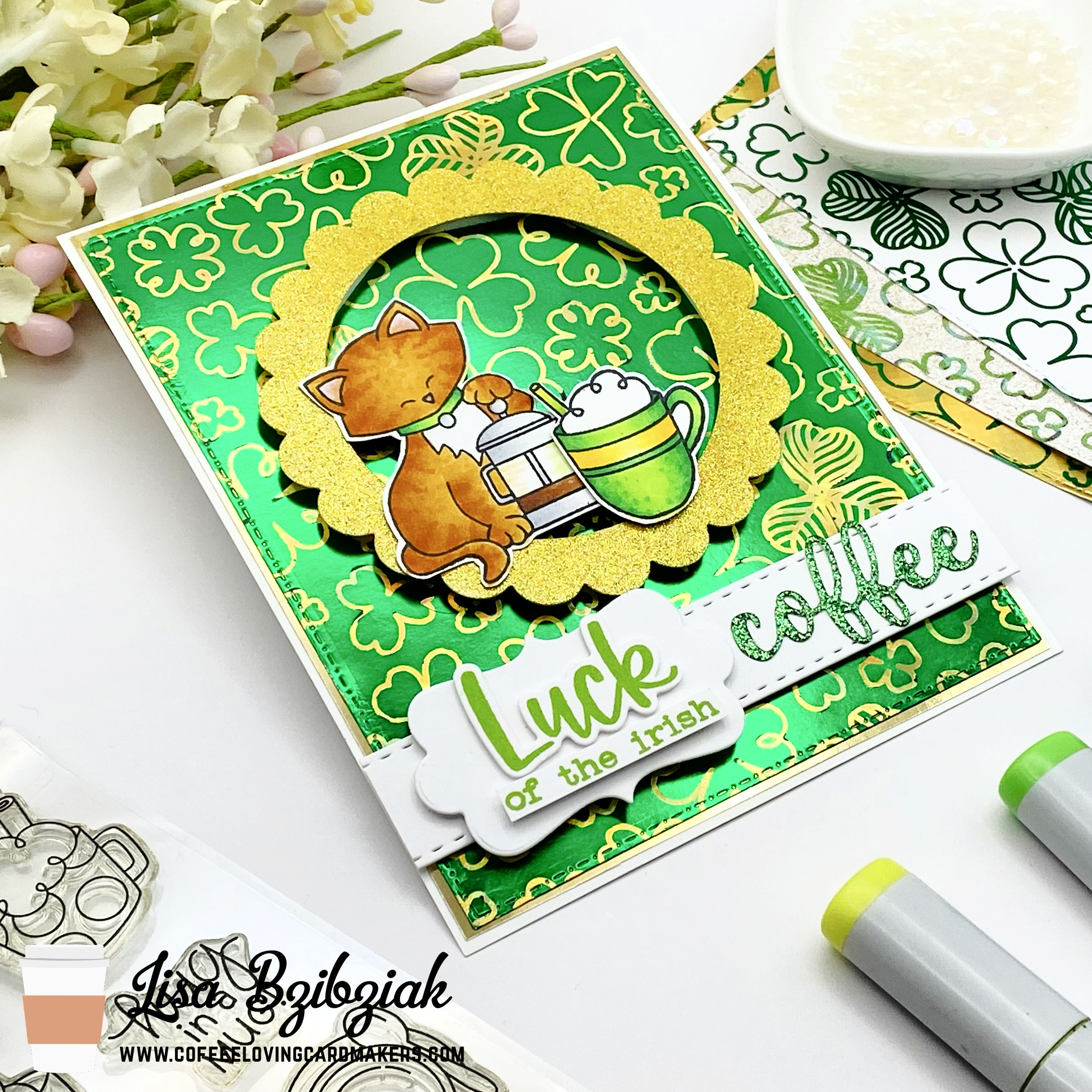 I have a confession! I’ve never had Irish coffee! I’ve just never been anywhere at the right time or where I know they make them… I guess this should be one of my fun goals if I’m any kind of a coffee lover! This background was created with a negative sheet (the green) of foil and some toner paper and then I ran it through a second time with gold.
