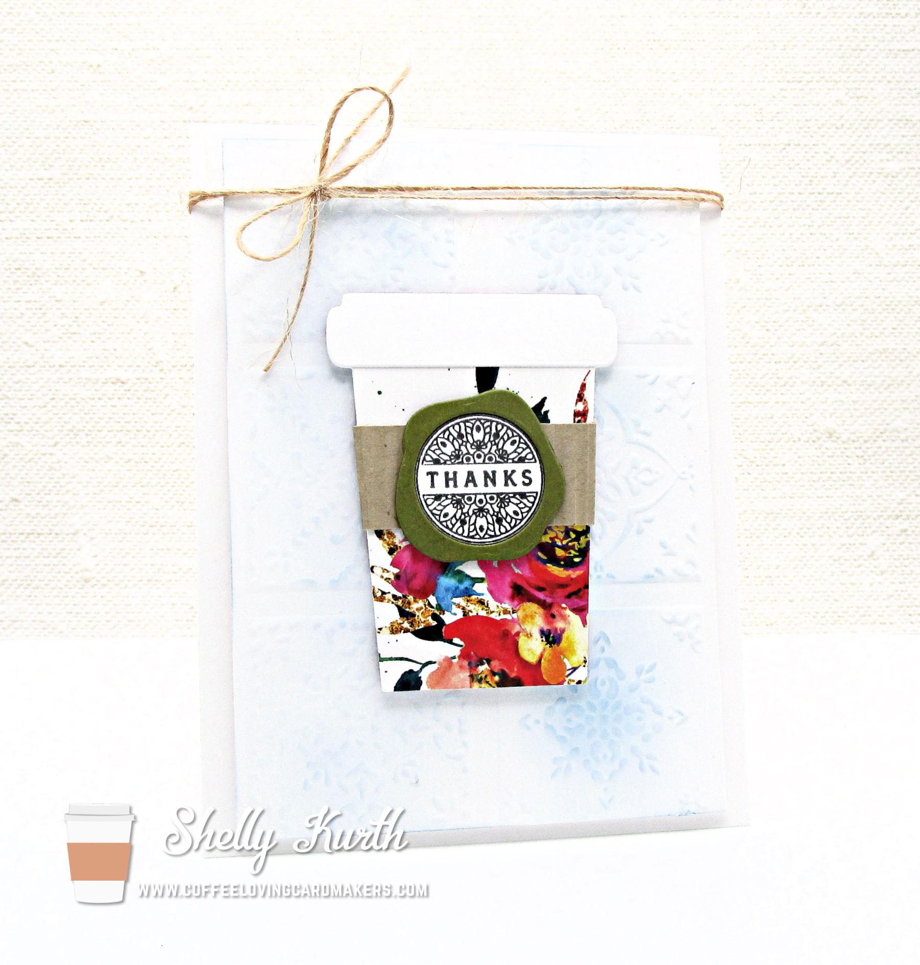 Oh yes, I kept things simple. I did some die cutting with patterned paper for the Coffee cup and then used a piece of Kraft cardstock for the cozy and used it with a paper crimper. To finish the cup off, a fun little die cut piece with sentiment. Now for the background, that took me some thinking! (lol) I went between a solid color cardstock, patterned paper, and then an embossing folder came to mind. After looking at things, I went with the embossing folder and did some quick and easy ink blending on it. Once done, I added my cup ti the background and that’s it! Simple, right?!…