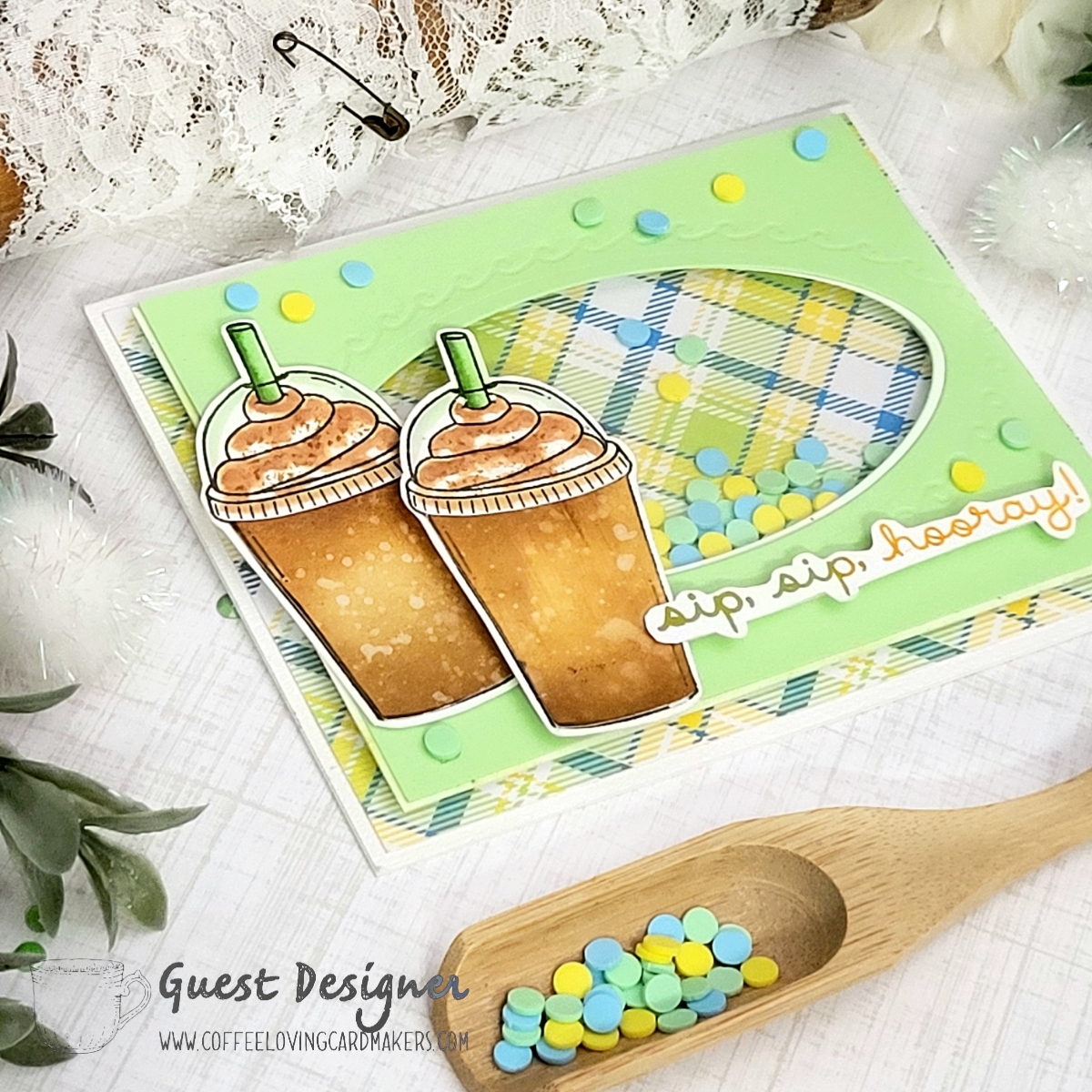 My backdrop of patterned plaid paper is from the Pink & Main Pop Flowers paper pad, and my shaker element was created using a Sizzix emboss die for my shaker panel. I’ve had some Queen & Co confetti in my stash for awhile and used those to fill my shaker and also embellish the top of my shaker panel. My sentiment is from another Inkblot Shop stamp set, Sweet Times Sentiments, stamped with more Catherine Pooler ink in Green Tea and Sauna.