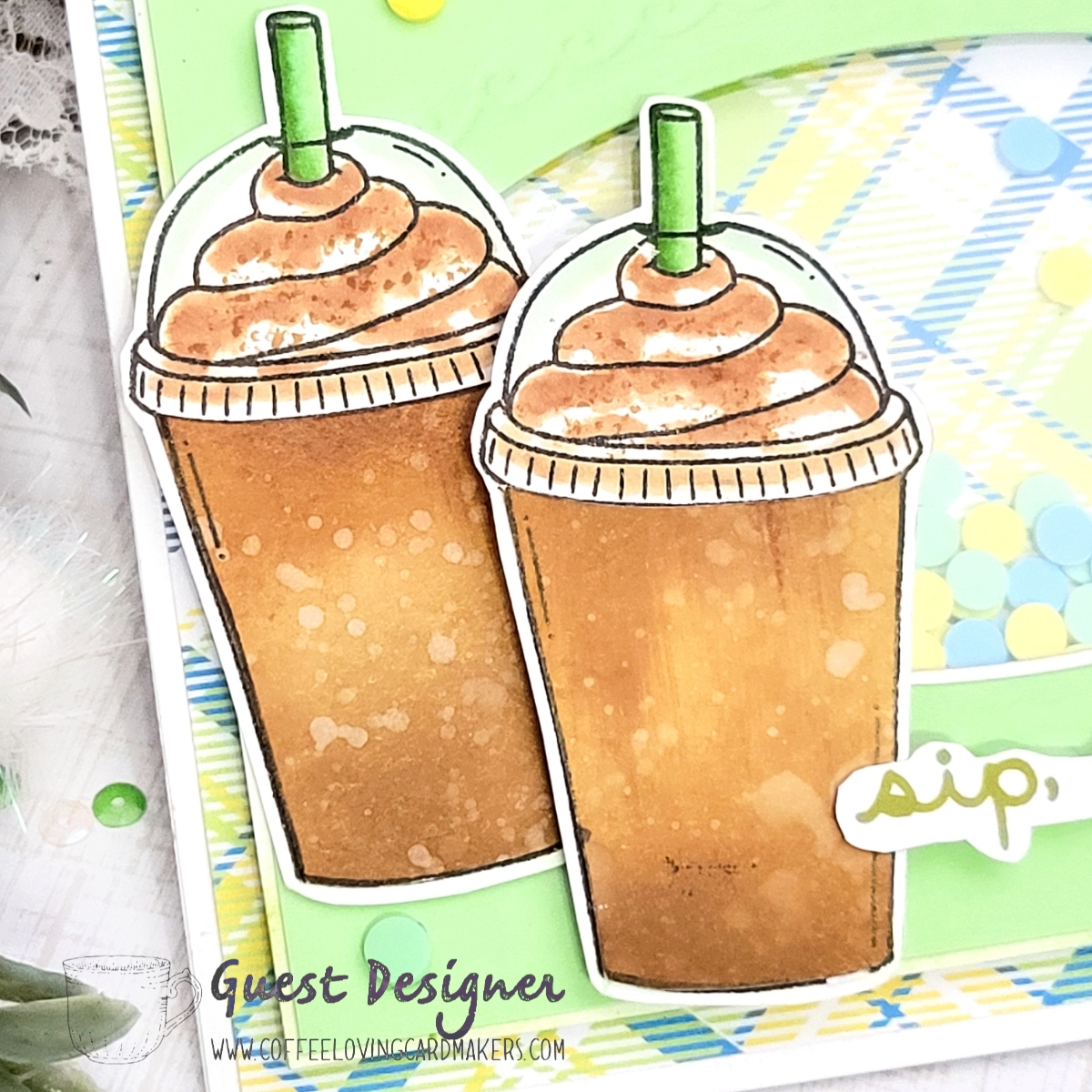 I used the ink smooshing technique on mixed media cardstock with my CPD inks in Gingerbread and Whipped Honey, then blotted some water droplets. When dry, I stamped my Inkblot Shop stamp several times (from the Hot & Cold Drinks stamp set), fussy cutting the bottom portion of the cup for paper piecing onto my other cup images that were stamped on white cardstock. My whipped cream and straw were colored using Copic Markers: E31, YG25 and YG11.