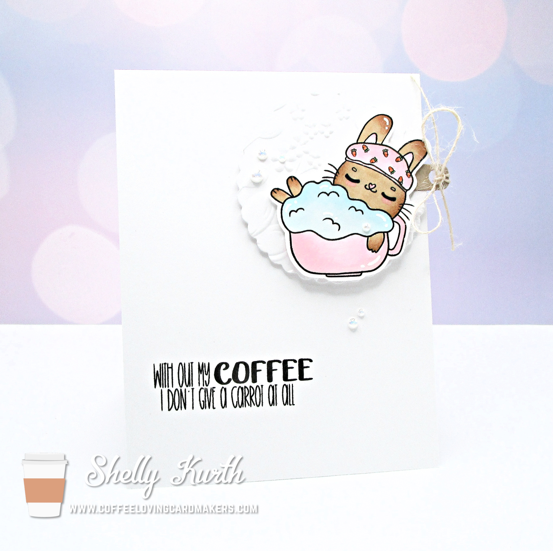 I did keep things simple. I did some coloring with Copic markers and then did some fussy cutting after. I used a circle die from Avery Elle and then used a 3D embossing folder from Erin Lee Creative. After, I added my colored image to it (using foam tape on the back) and added some burlap twine. Lastly, I stamped on a sentiment to the card, added the images and topped things off with a touch of pearls. Cute, right?!…