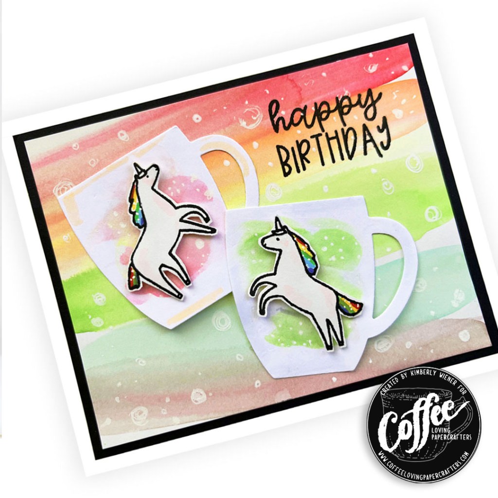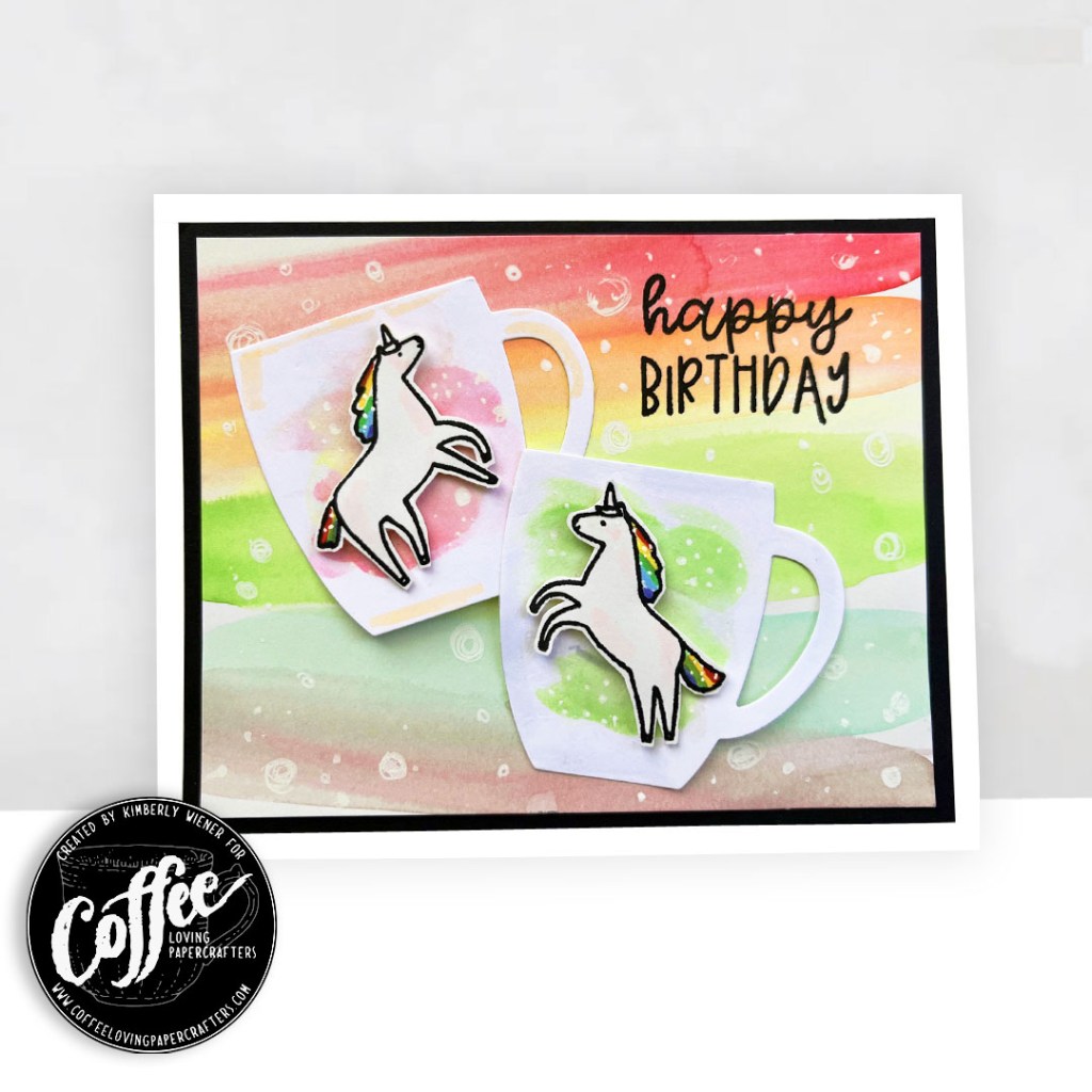 I cut the teacup die twice onto white cardstock and swiped some washes of color onto the center of each one. I stamped the unicorns in Onyx Versafine Black onto white cardstock, copic colored them, then fussy cut them out.