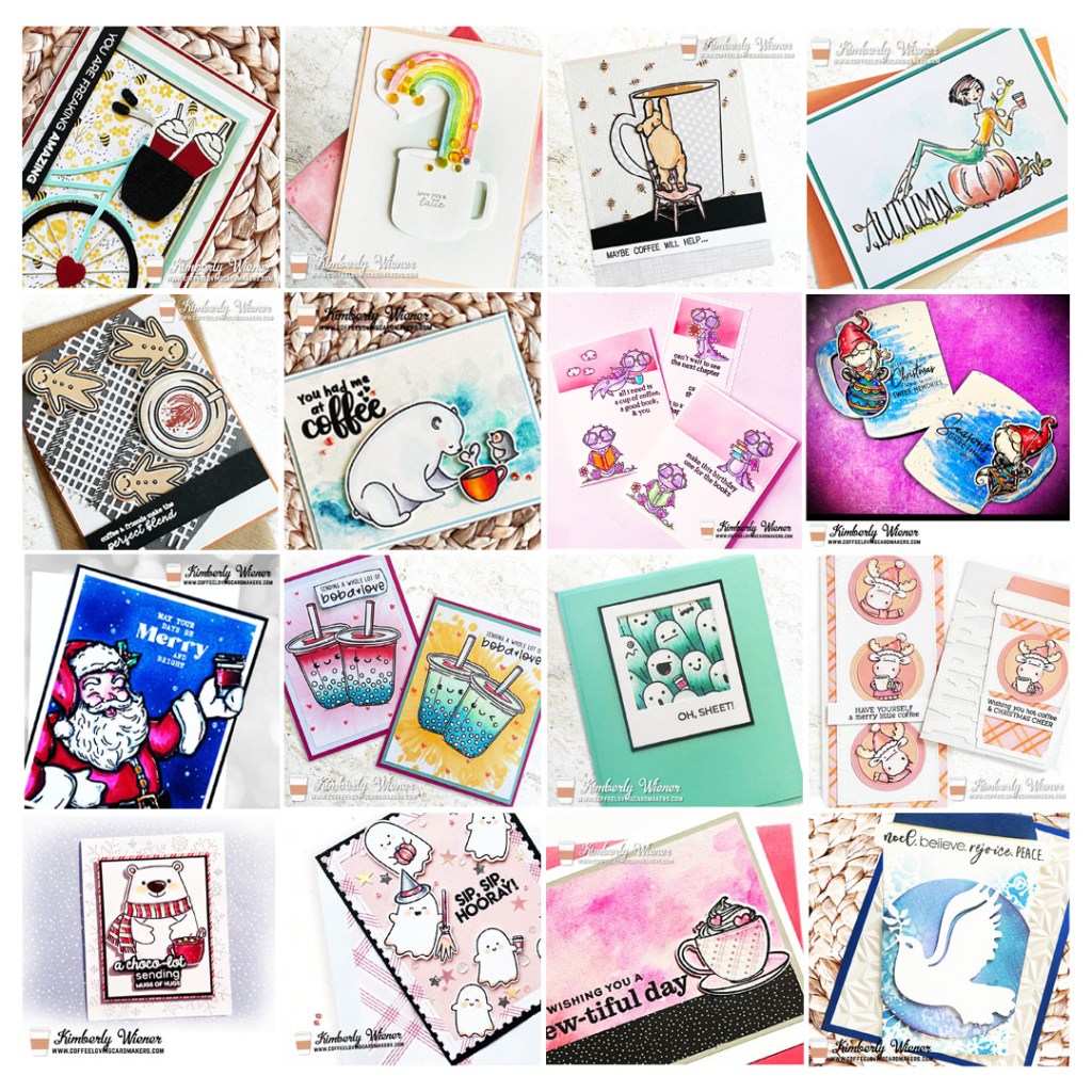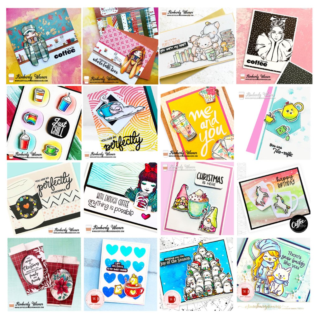 Here are all of my creations, with a few guest cards for the Caffeinated Christmas Card Challenge tossed in for fun as well. My favorite card over this year is the JUST CHILL card (sixth card down on the far left) with all of the cups and the rainbow mug. Perfect for this month!