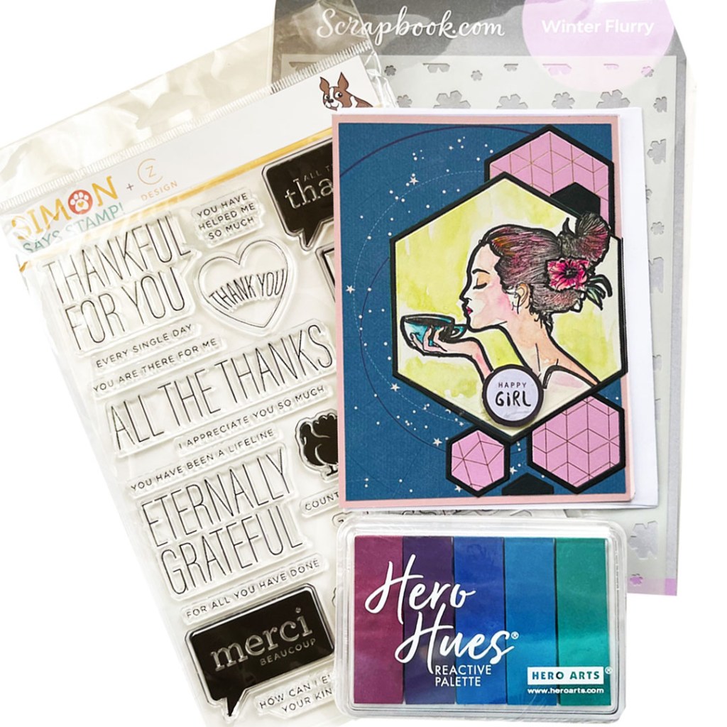 Grand Prize: The Grand prize consists of an original card made by me, (original post with details on the card Here): Hero Arts Reactive Ink Palette, SSS Thank You Stamp Set, and a Scarapbook.com Stencil.