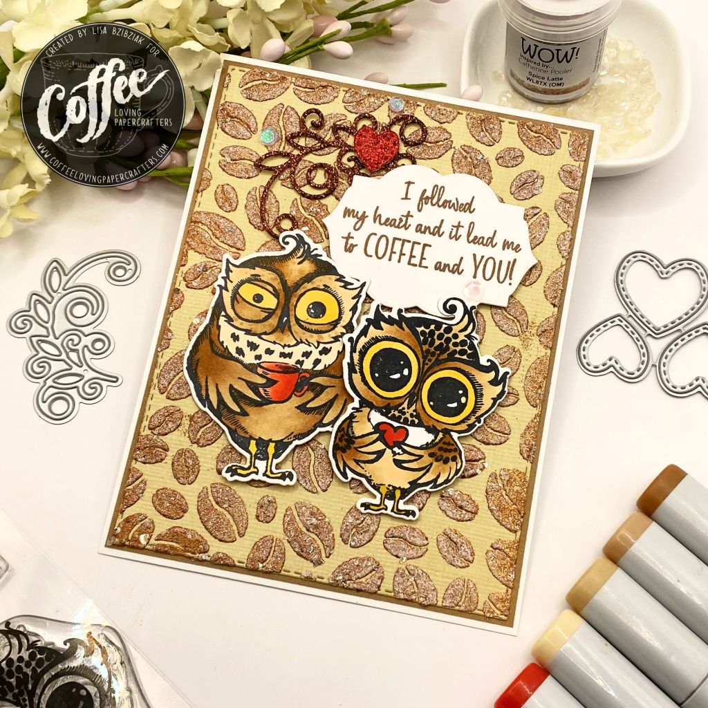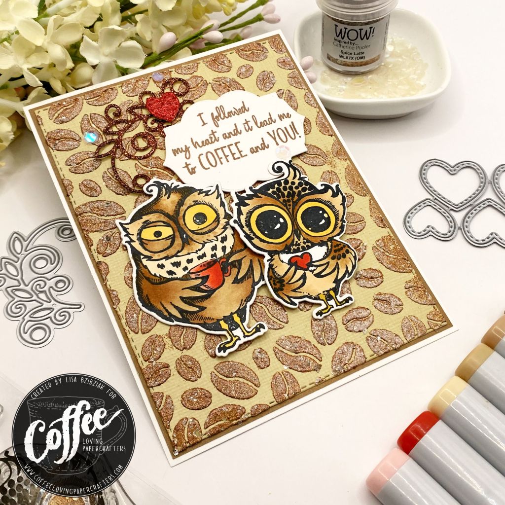 I created the background using the Coffee Bean Stencil. I applied some Therm O Web Transfer Gel through the stencil and then some of that yummy Spice Latte embossing powder from Wow and heated it… I love embossing with Transfer Gel or Texture Paste… it’s so cool to see it bubble up as it gets hot and I love the extra texture it gives.