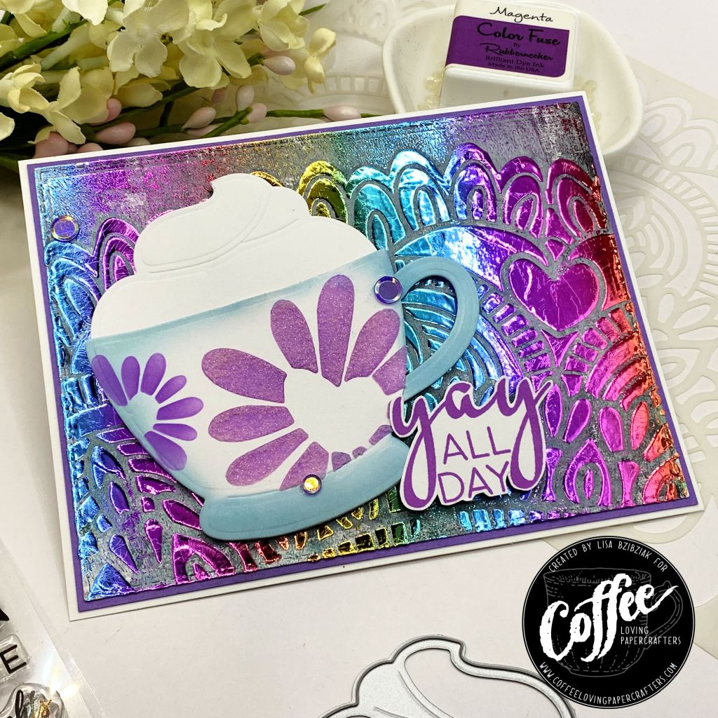 I created the background with a gel print and I added some Transfer Gel Duo through that gorgeous Lacy Edge Stencil. When it was dry, I ran it through my Fuse at a low setting with some rainbow Deco Foil.
