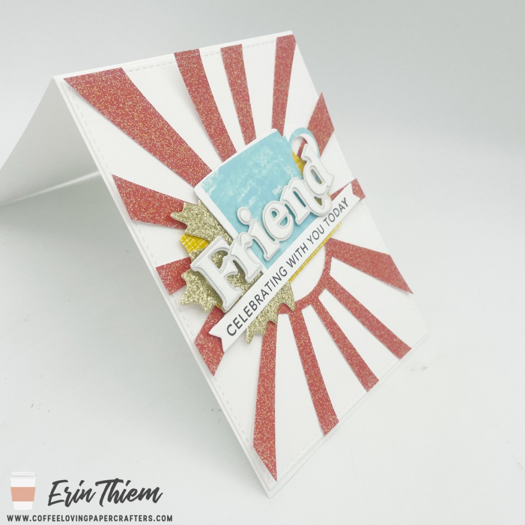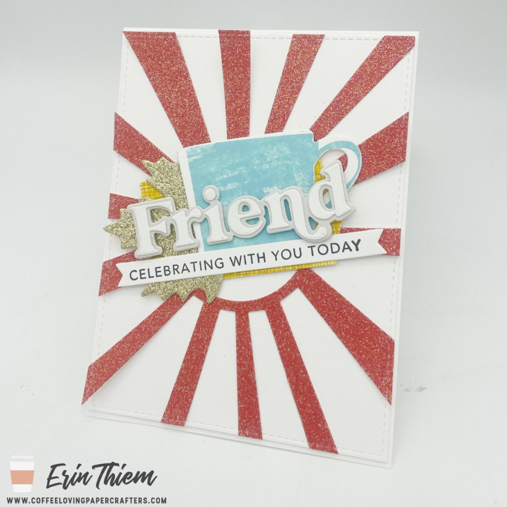Hello, Erin here with another Creative Chaos Saturday post. I love the sparkle on this card. For a girl who loves white on white, sometimes you need a little pop. I’ve paired a number of goodies to make today’s card, the coffee mug is from Papertrey Ink, the Friend sentiment and background die is from The Stamp Market, the sentiment from Taylored Expressions and the leaf from Lawn Fawn.