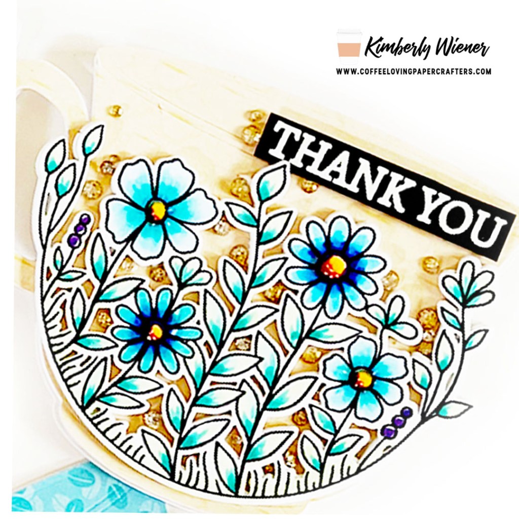 I used the cup die to cut a full panel on white cardstock as well die cut only half (front side of card) in bright fab papers from the Kat Scrappiness Coffee Quokka Set. Did you see the coffee bean detail of the blue paper?
