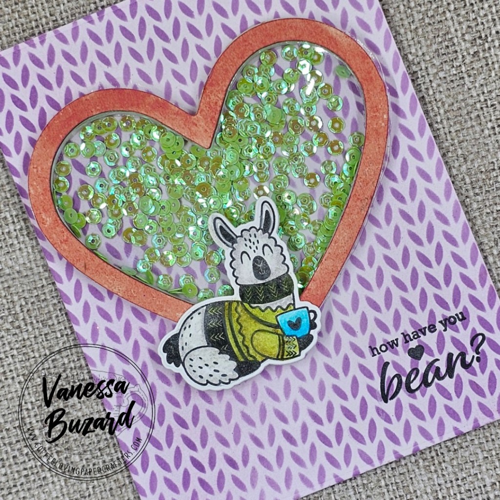 I glued the knit card front to top folding A2 card base, assembled shaker onto it, stamped the sentiment lower right, and attached the colored and die cut llama out to the heart.
