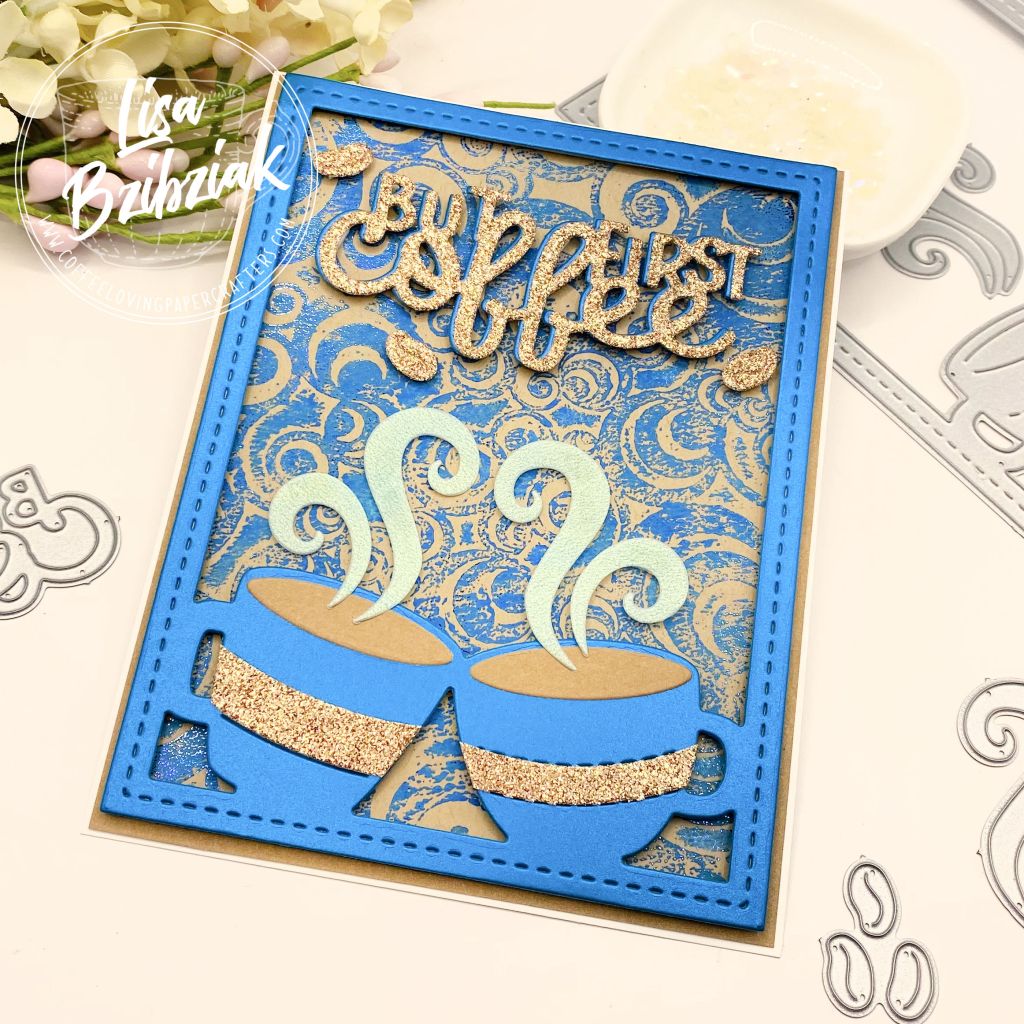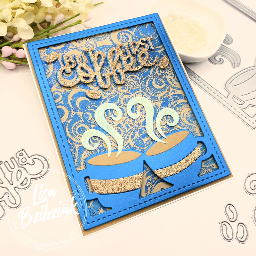 For today I’m using the Coffee Frame Die Set! All of the pieces on this one are from that set. I used papers from previous Your Paper Insider boxes (new box is coming!) That bright shimmery blue is from the last box as well as the vellum from the steam.